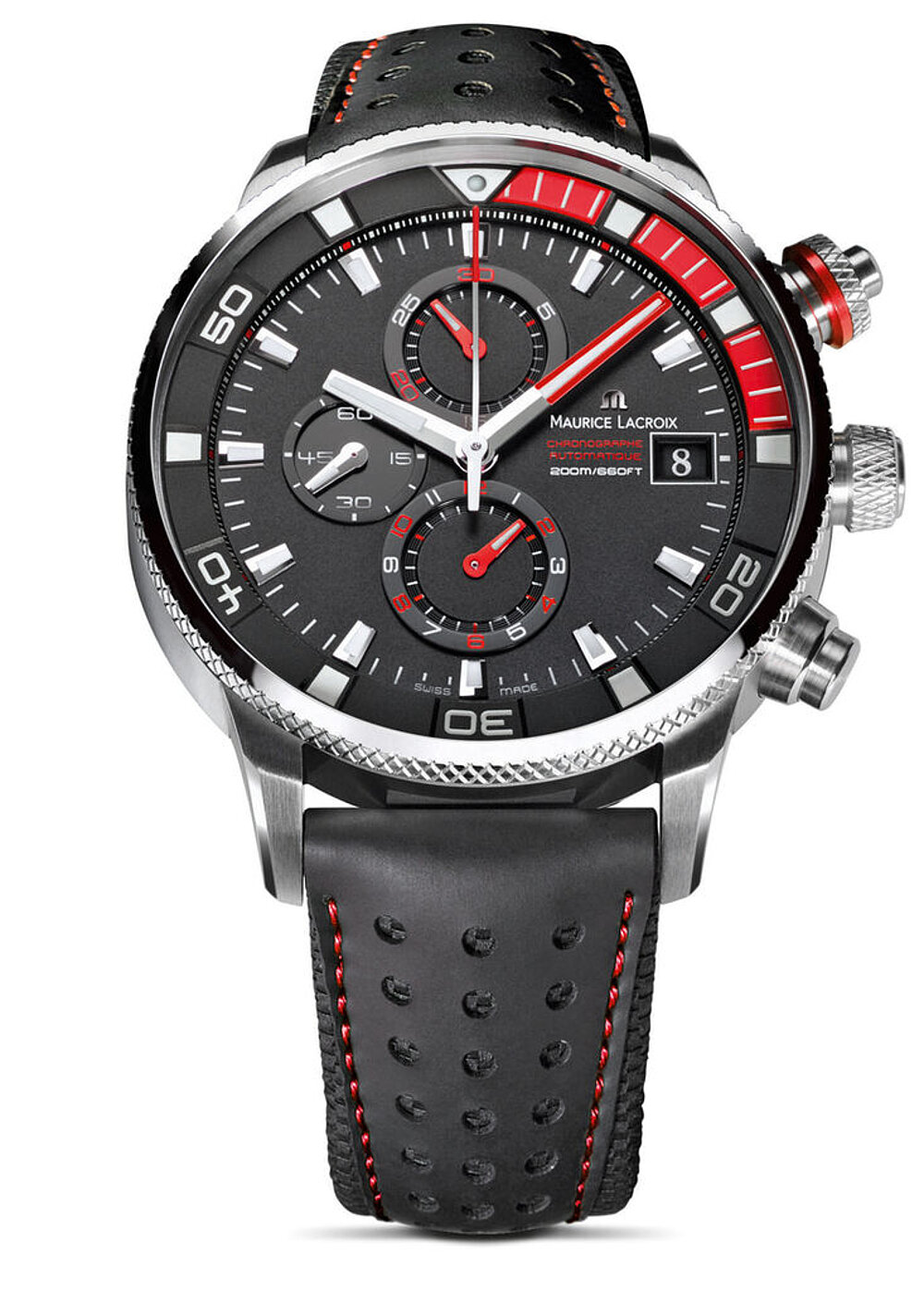 The brushed, polished case of this timepiece is made of stainless steel and measures 48 mm overall. Red and white elements contrast with the black dial and therefore make it very easy to read. Both the hour and minute hands are diamond cut, luminous and colour-coordinated with the patented, rotational inner bezel. The chronograph function includes a central second hand and a 30-minute and 12-hour counter.