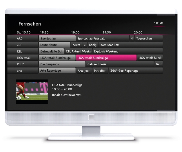 The Programme Manager is part of Entertain, which is Deutsche Telekom’s digital television package. It offers users a consistent experience and an intuitive interface on all available platforms: smartphone, computer and television. The Programme Manager displays the TV programme for the next 14 days, suggests movies, is equipped with search functionality, sends reminders and provides many other services. Users can programme their hard-disk recorder online via their smartphone, tablet or desktop PC; they can also record TV programmes and watch them at any time with­out commercial breaks. With more than 70 television channels, 2,500 international radio stations and 10,000 movies in the online video library, Entertain assumes a prominent role in the German IPTV market.