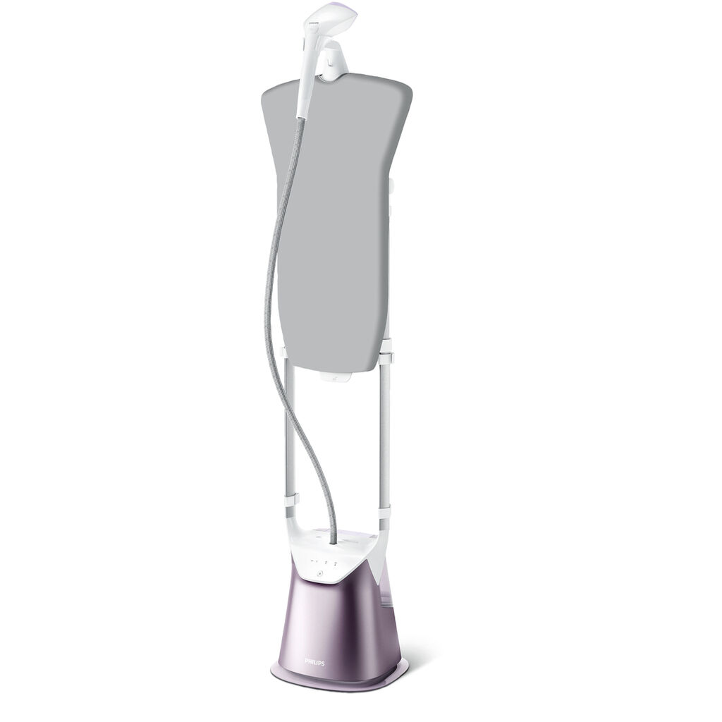 The compact ironing station that requires little space for storage consists of a double motor, a tiltable ironing board and a handheld steamer. Ergonomic and aesthetic aspects blend into a powerful and well-thought-out household appliance. The ironing board’s dimensions are generous, and the tilt mechanism can be released with only one hand. The OptimalTemp technology automatically sets the temperature of the steamer which can be operated conveniently on the handle.