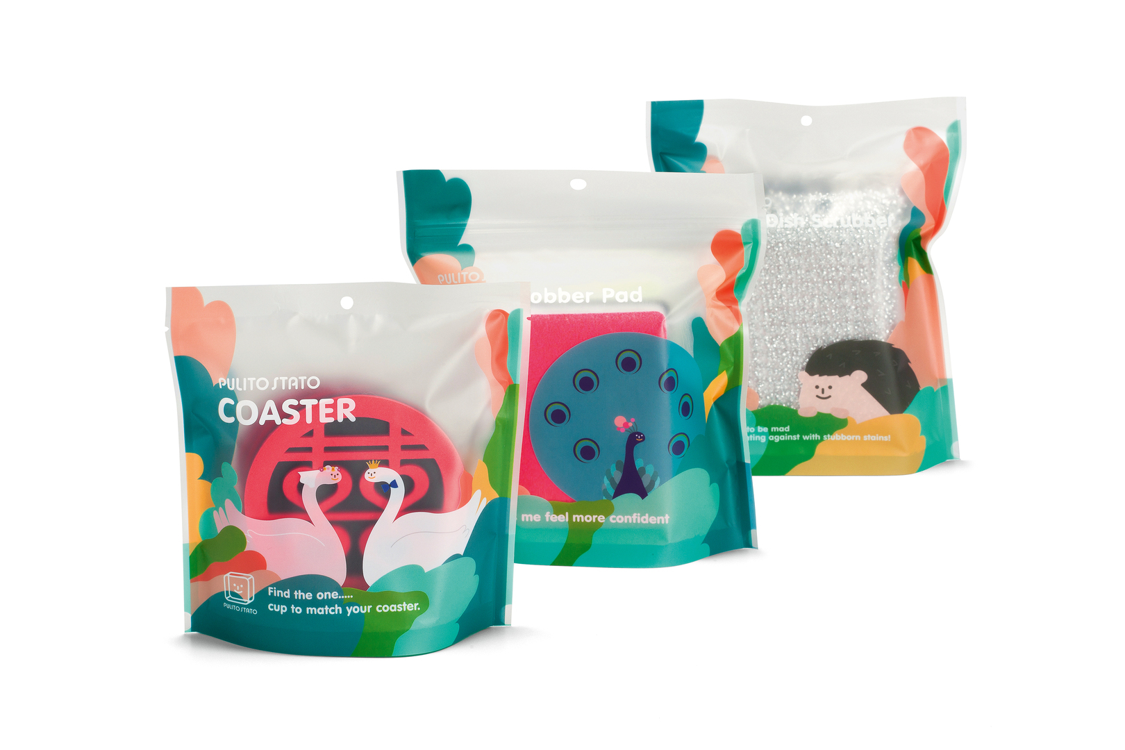 The packaging design of Pulito Stato consistently succeeds in conveying the message of the brand in a credible manner. That cleaning can also be fun is visualised by both the colourful graphics with laughing animal faces on the packaging, as well as the formally adapted sponges or scouring pads featuring inside the package. Harmoniously and, above all, humorously linked to one another, they enhance the purely functional purpose of the products by projecting a charming appeal.
