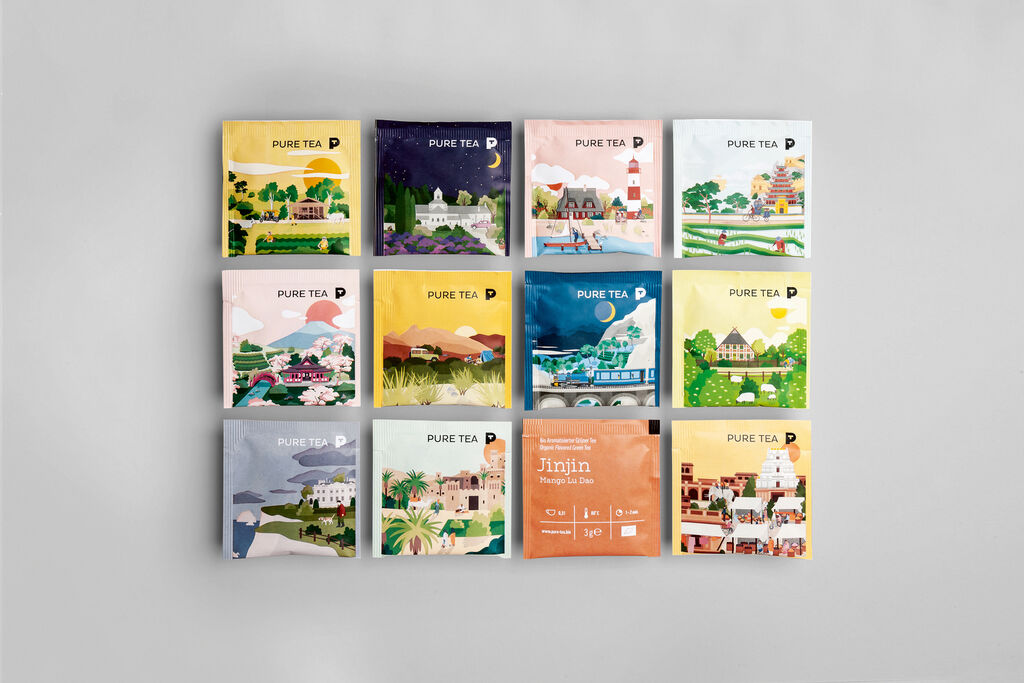Pure Tea is an organic tea brand that covers premium-quality teas from many regions of the world. Owners and tea specialists Andreas Brehm and Ralf Janecki often visit local farmers in the Himalayas, Japan and South Africa, for example, and maintain close personal relations with them. This gave rise to the idea to call the teas after the first names of their farmers. Complemented by colourful illustrations, the packaging conveys impressions of the region where the individual teas are picked. The USP of the brand thus is communicated in a very inspiring yet incidental manner.