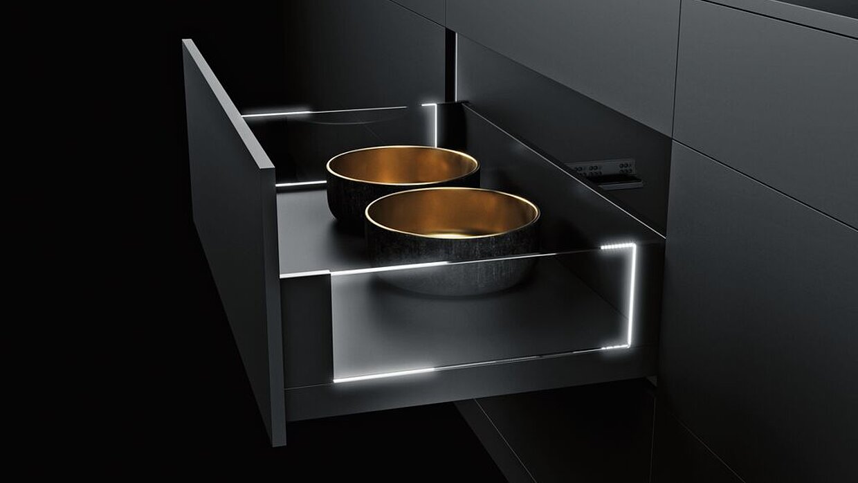 The Quadro Compact FE 20 runner system allows wine racks to be opened and closed without shaking, so that the stored bottles are always moved gently. A hybrid ball bearing ensures particularly quiet, low-vibration guidance of the runner. Optional features such as the damped self-closing mechanism increase user comfort. With its dark surface, the Quadro Compact FE 20 also perfectly matches modern wine coolers.