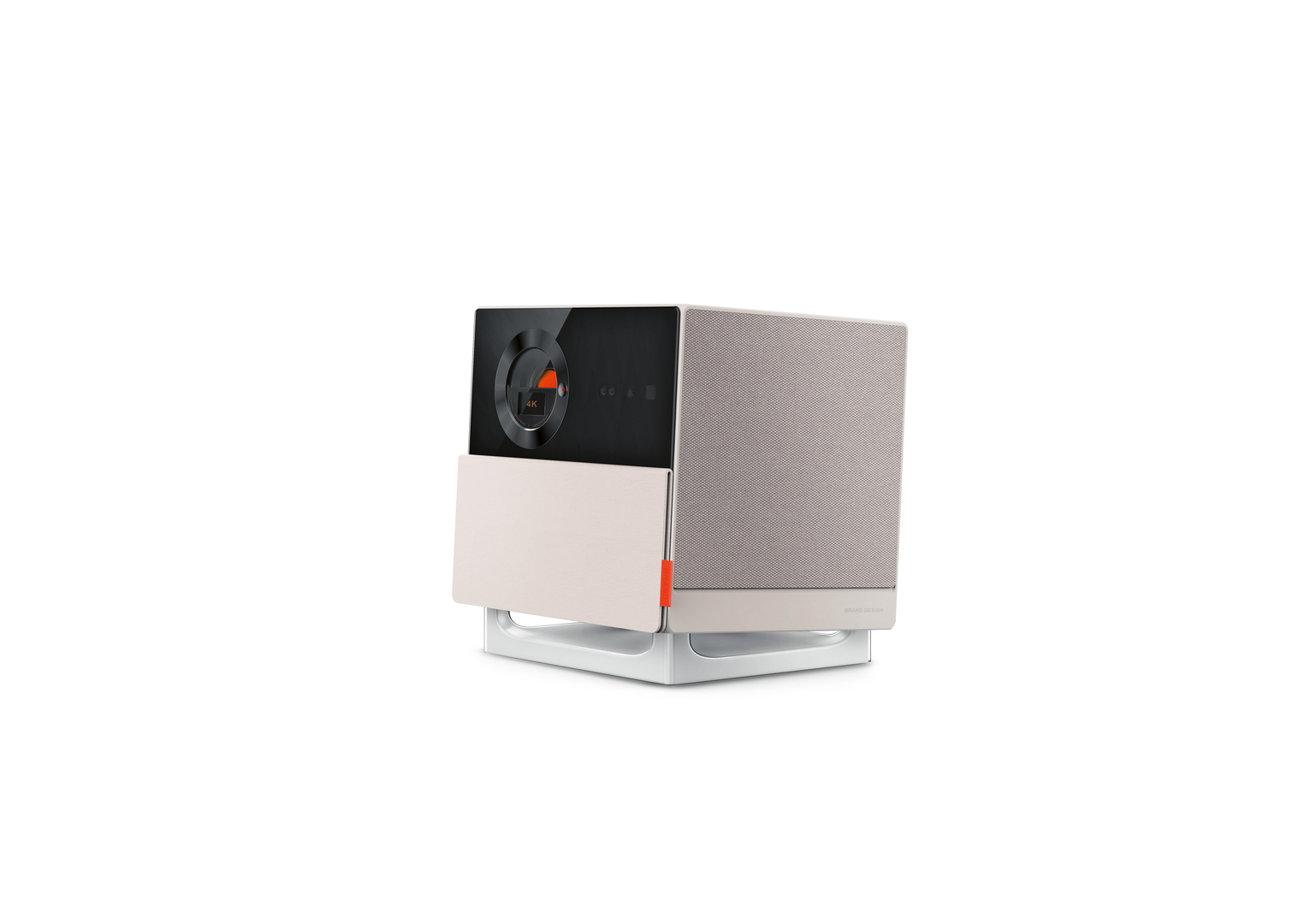 The R1 Pro is a 4K laser projector that combines performance with an appealing appearance. The device relies on clean lines and the interplay of different materials and surface textures. The front is equipped with a magnetic flip cover made of organic silicone, which also serves as a power switch. The illuminated sound cone base with the downward-facing subwoofer maximises the sound quality. In standby mode, the device serves as a light that responds to music rhythms and speech, thus expanding the user scenarios.