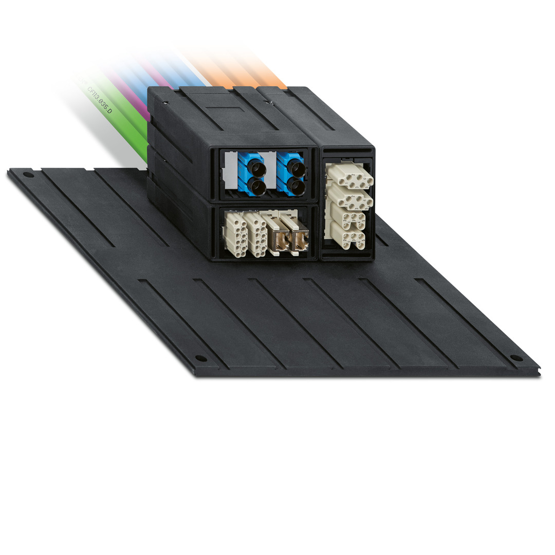 With the readychain module connect, individual connector interfaces with high contact density can be assembled in a modular fashion. Each module is equipped with up to four industrial connector inserts and configured to suit the application. The modules can then be joined together, allowing almost unlimited variations in individual widths and heights. Thanks to its slim design, the connector can be adapted to the geometry of e-chains in one or more layers.