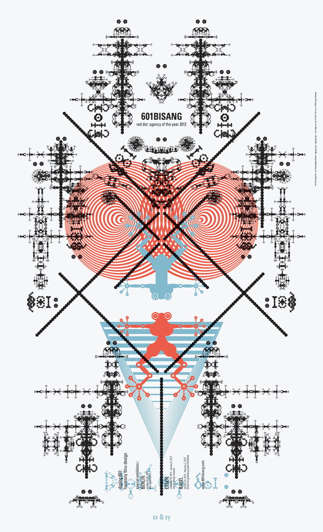 These exhibition posters feature strong visual imagery with the aim of visualising the digilog concept of the Red Dot Design Award. The series expresses the concept as a living thing by overlapping Frog Script to create the shapes of biological creatures. The initial letters of the motifs “XY”, “TS”, “EW” and “FT” were arranged to form skeletons and symbols that correspond to the individual motifs and complete the shapes of the bodies. Each poster features two complementary colours chosen to embody the concept of mutual production. This restrained use of colour also makes the detail in the posters stand out.