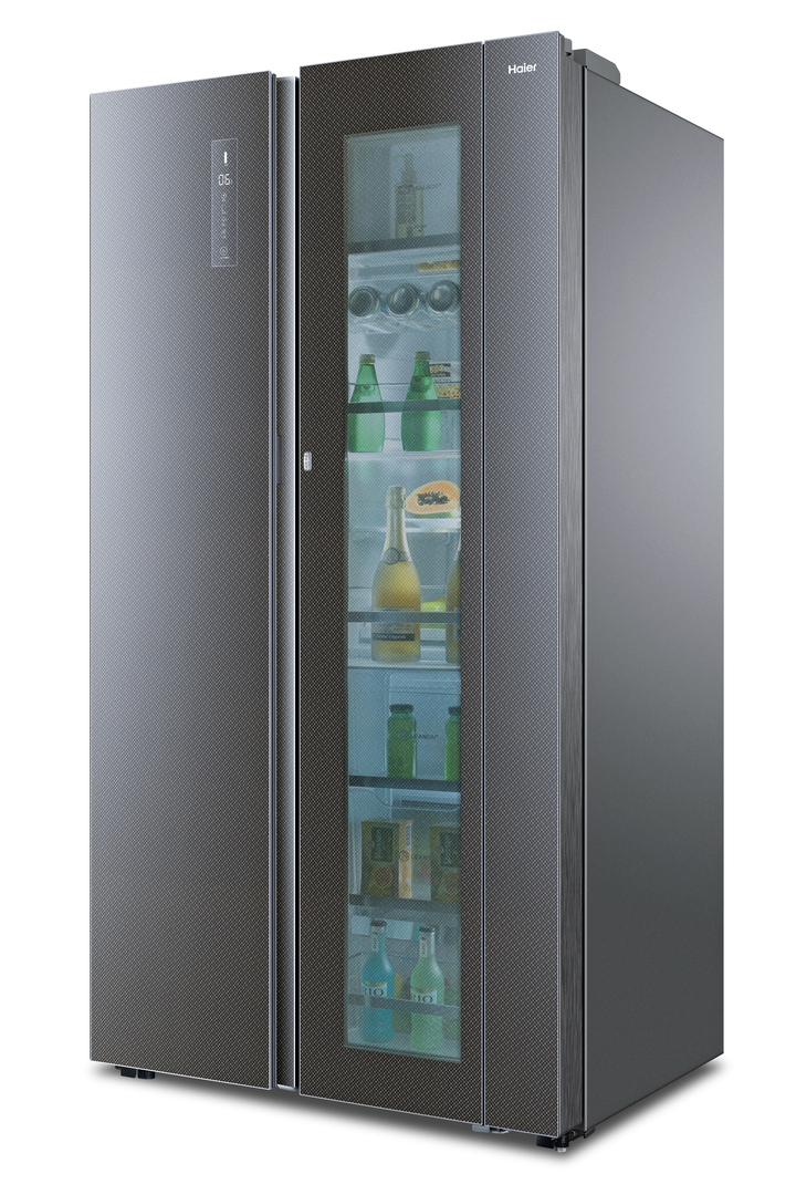 The design of the Ref-SmartWindow is based on the idea that a refrigerator can also be a status symbol. Its appearance is accordingly up-market, whereby integrated transparent areas at the front are the main feature. When the user approaches this Smart Window, it automatically lights up and presents a view of the food which is stored within easy reach behind the first door. At the same time, the refrigerator thus gives an impression of technical sophistication and clear interior design which is characterised by transparent areas and metal details.