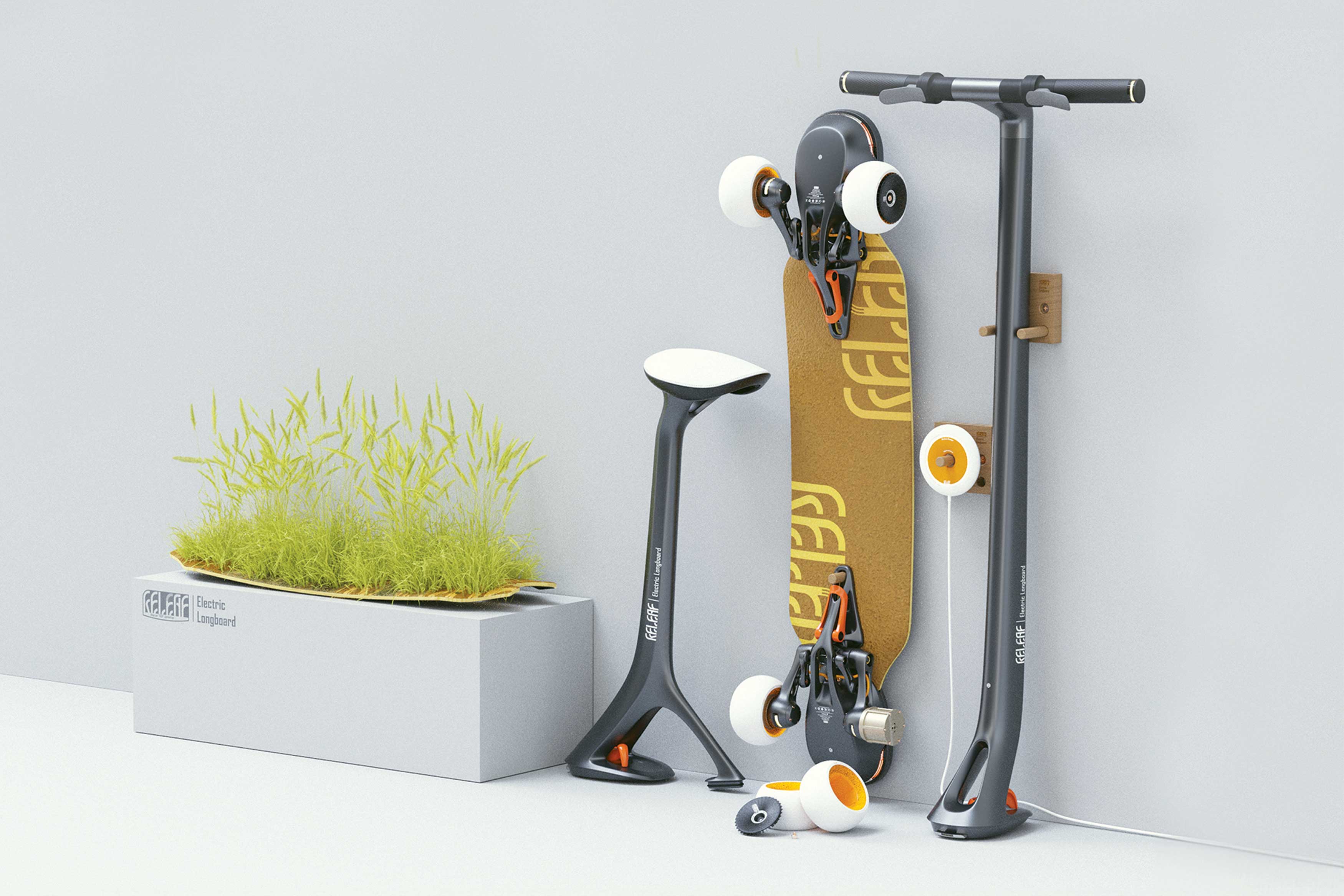 The RELEAF longboard features electric assist, large hollowed-out wheels for shock absorption, and a seed-embedded wear-to-sprout deck that germinates with frequent use. In addition, the wheels clean the city streets as they spin. This urban skating-and-greening experience is further enriched with adaptable accessories, such as detachable handles and ergonomic seats, that transform the longboard into an eco-friendly scooter or seated ride.