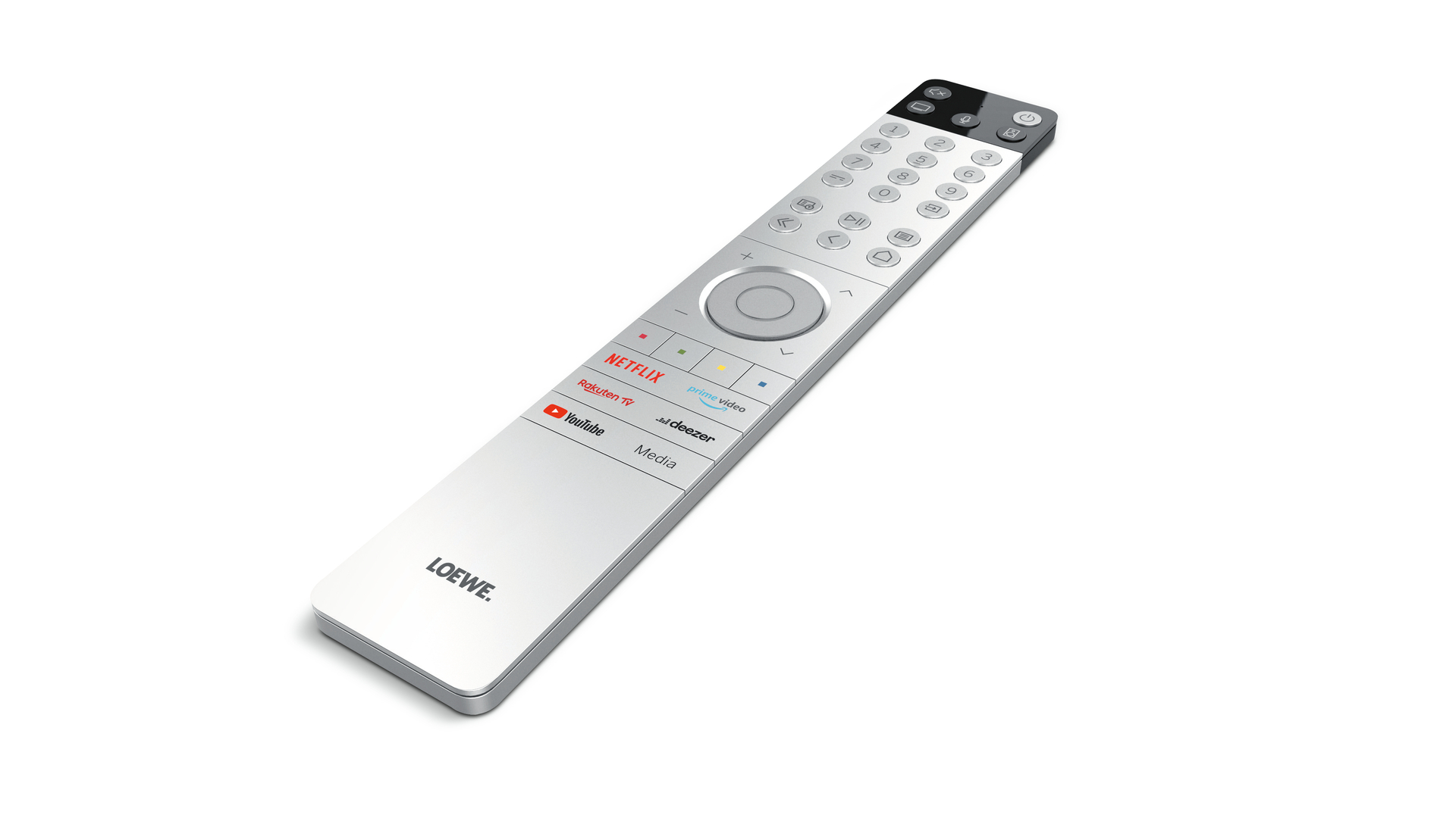 With its ergonomic shape this remote control sits easily and securely in the hand. Clearly organised shortcut buttons take users directly to the most important VOD and AOD apps. The navigation key functions can also be altered for easier operation when playing on-demand content. The remote control is designed for the new TV and audio models from Loewe. Thanks to its built-in microphone it can be controlled with voice commands.