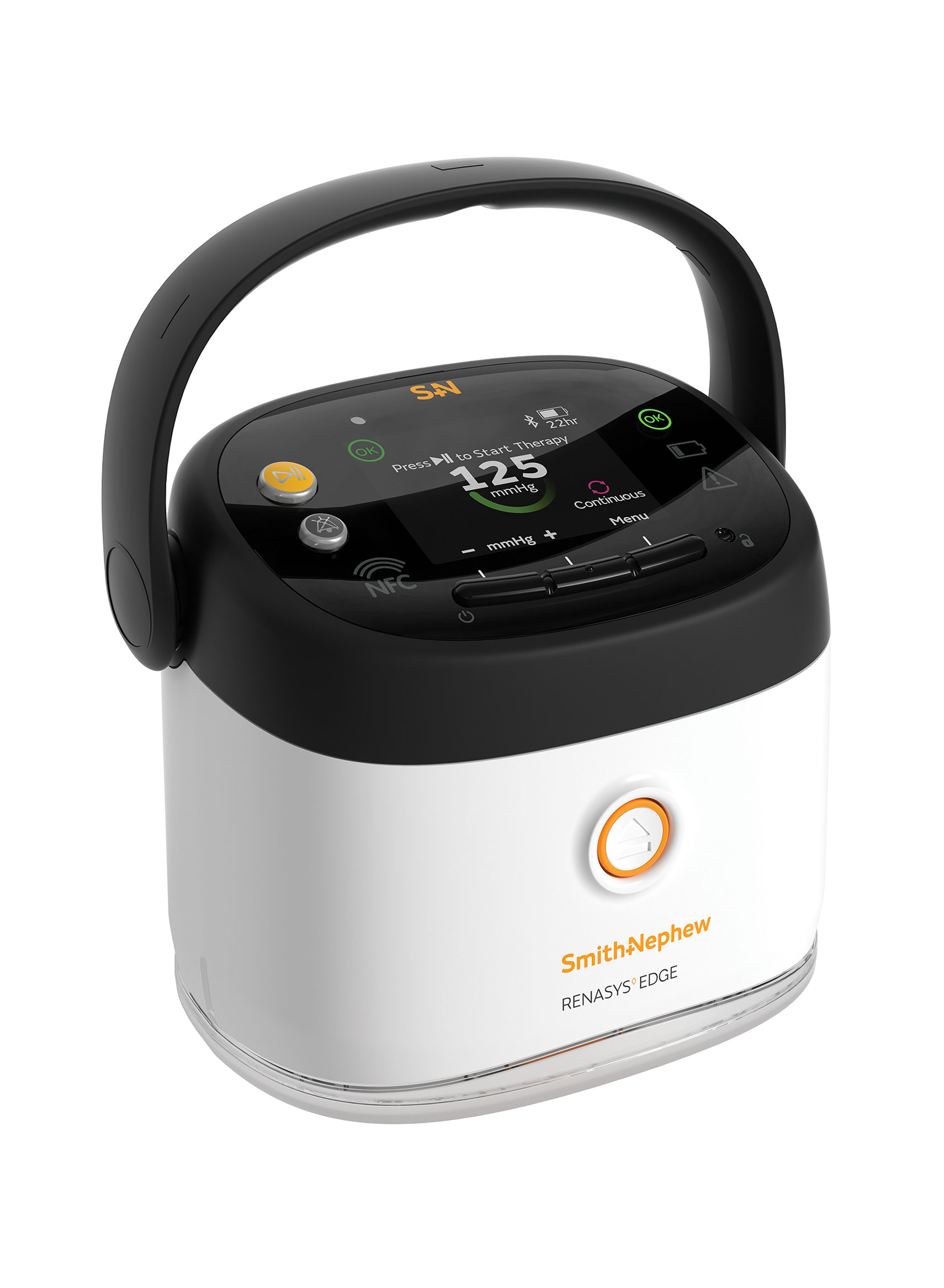 RENASYS EDGE is a next-generation NPWT system that applies sub-atmospheric pressure to aid wound healing while prioritising patient discretion, simplifying turnaround between patients, and reducing maintenance overhead.