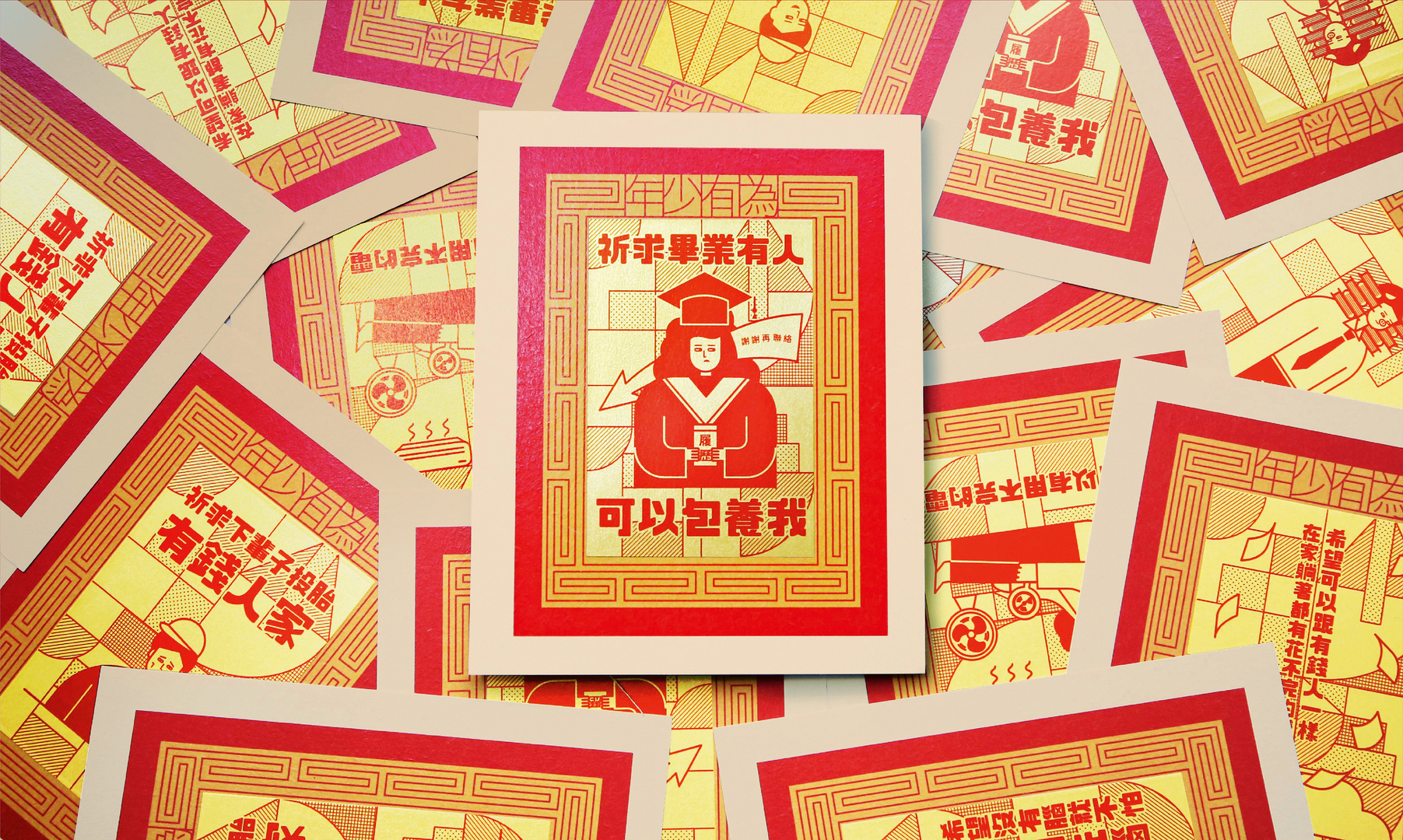 The realisation that many of today’s social problems are still yet to be solved or improved prompted the project “Resolution Joss Paper Shop”. Using prayers to symbolise the desire to tackle social issues, the project adopts the aesthetic of traditional Chinese paper products known as joss paper, or ghost money. These are sheets of paper traditionally used in Chinese cultures as burnt offerings to gods or to honour deceased family members to ensure their spirit has a good life in the next world. With an attractive, predominantly red and yellow design, the printed work aims to bring greater attention to social problems.