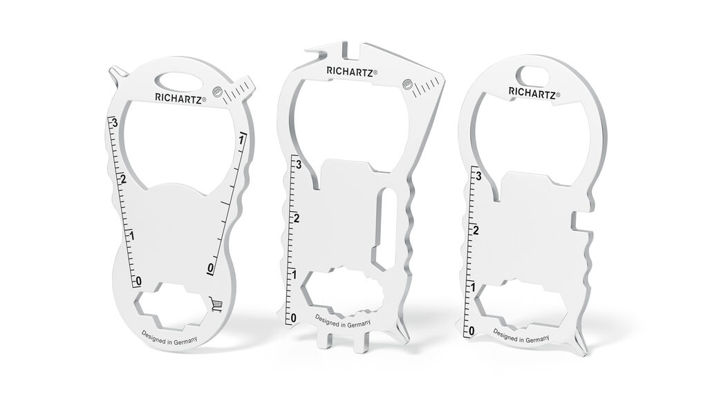 The RICHARTZ KEY TOOLS compact series is the particularly handy version of the original RICHARTZ KEY TOOLS and combine up to 17 functions in a minimal space. Made from matt-finished stainless steel, these multi-tools impress with their precise finish and clearly recognisable, embossed functional surfaces. Whether as a shopping aid (shop), DIY tool (work) or versatile all-rounder (13+), each version offers well-thought-out solutions for everyday life, the household and hobbies. It is compact, robust and always ready for use.