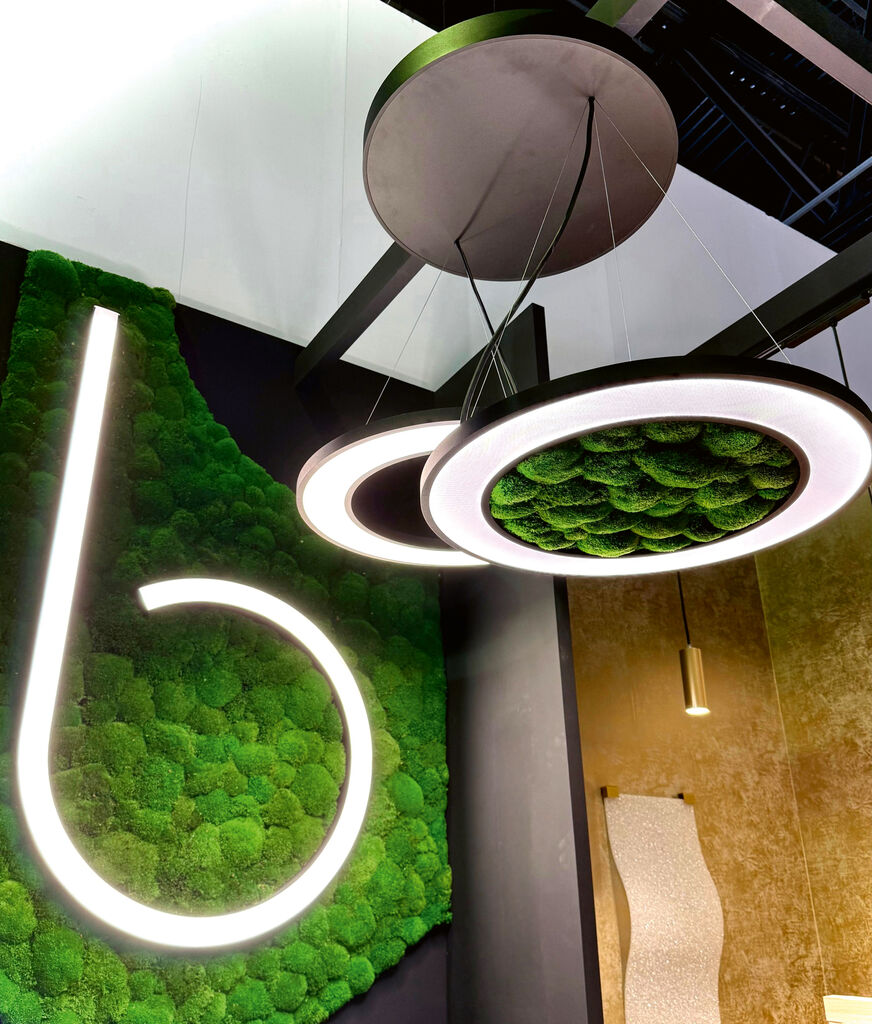 The Rotao24 is a ring-shaped light for residential and commercial interiors. Its sleek aluminium profile combines edge lighting technology with a powerful light output. The lamp is available in a variety of diameters and can be suspended or surface-mounted with either direct or direct-indirect light distribution. In addition, the Rotao24 can be equipped with advanced features, such as sensors, Tunable white or Bluetooth technology. Acoustic materials, including moss and upholstered panels, are available for enhanced acoustic comfort.