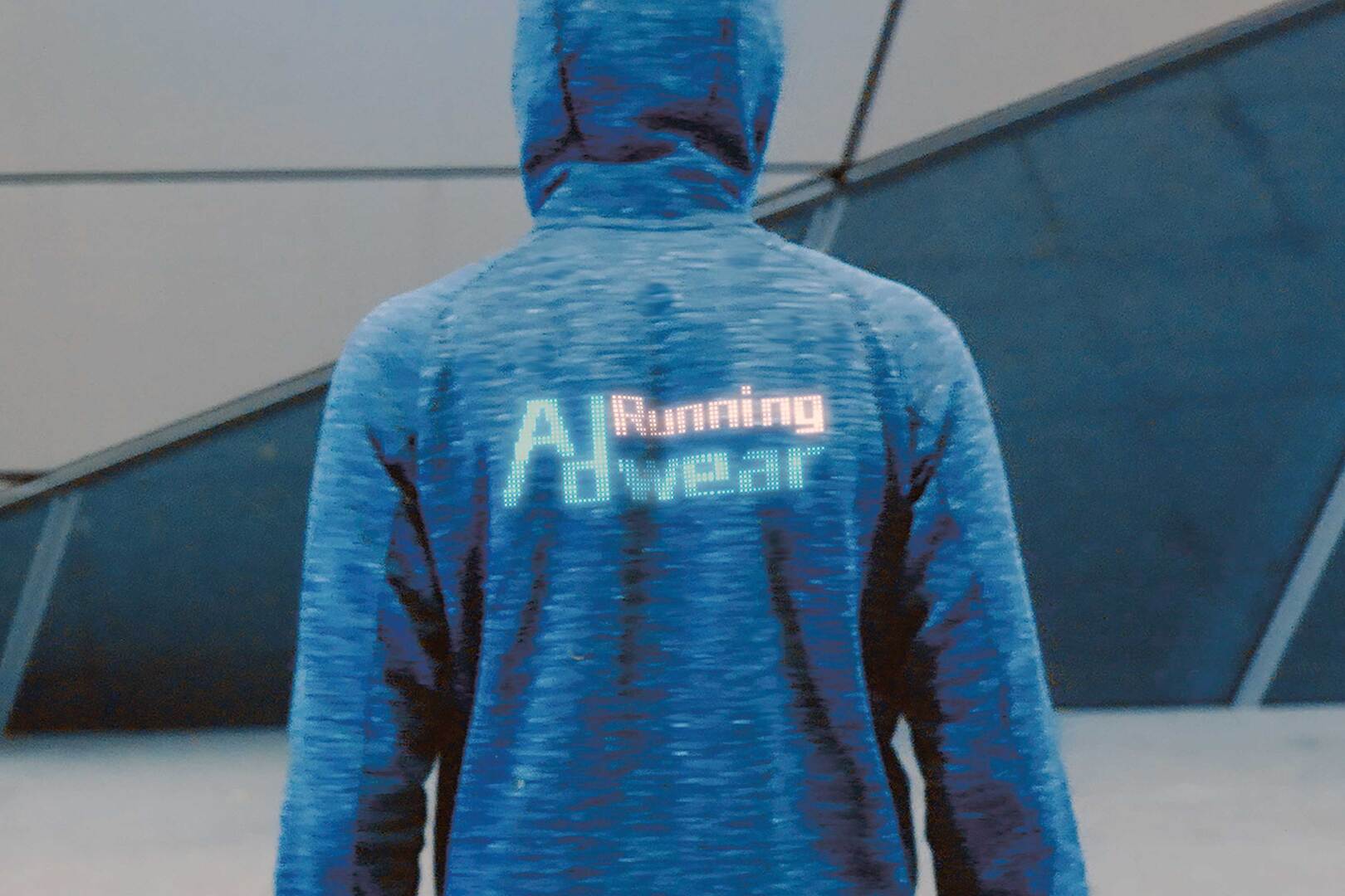Running Adwear features wearable LED and connects to GPS via Bluetooth using an app. It uses the cloud database to detect the location, area, and weather. It then accurately places the advertisement based on the data, and changes the content at the right time and place, in real-time. This ensures that every step is supported by data, transforming every runner into a new mobile digital media.