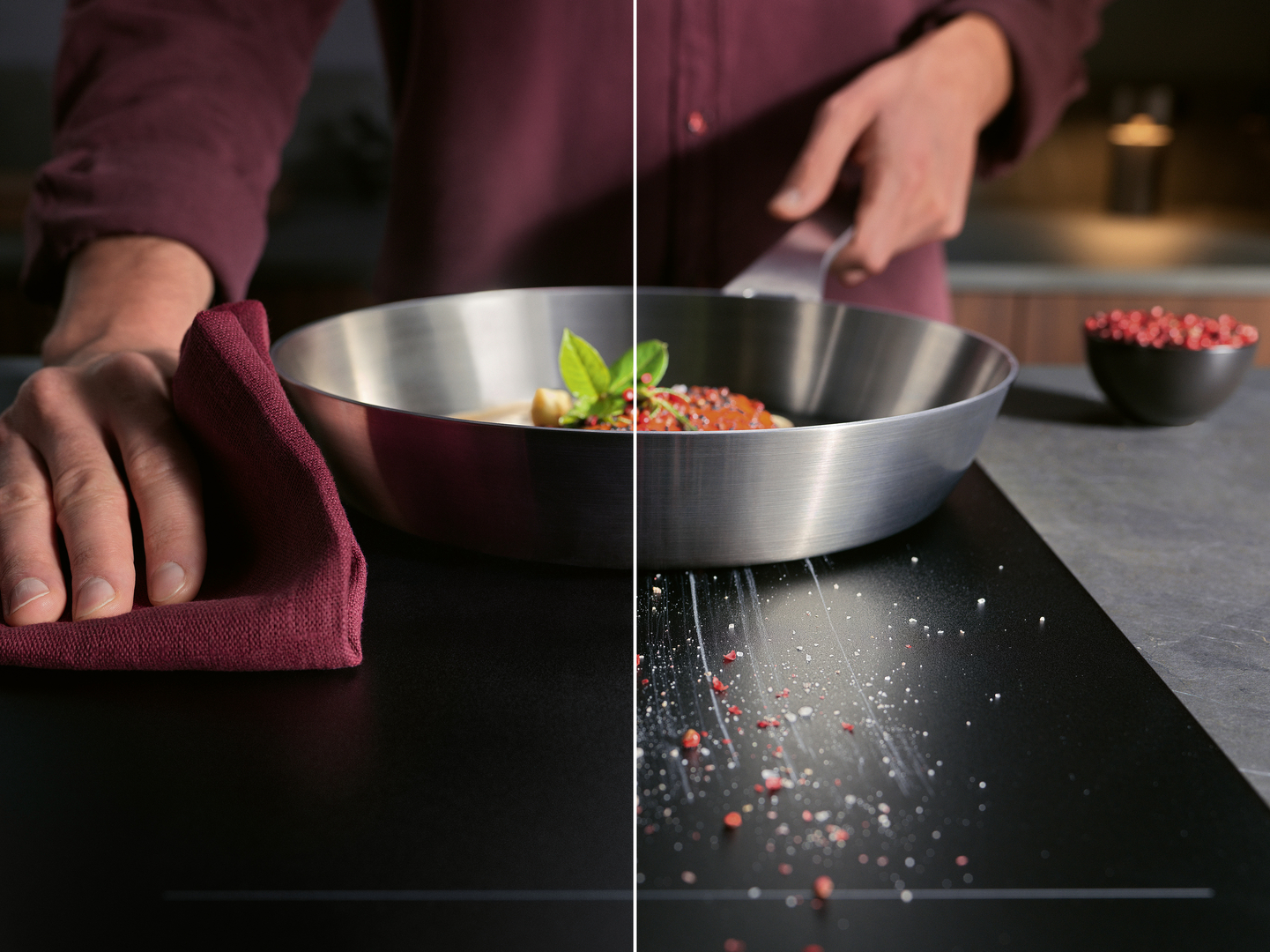For many people, kitchens are much more than just functional rooms. People who are passionate about cooking or enjoy spending time with friends or family in the kitchen want to be surrounded by appliances that are both practical and aesthetically pleasing. Hobs are one appliance that tends to show signs of wear over time, such as stains or scratches that refuse to be removed. The SaphirMatt glass surface for hobs is the solution. It has a paper-like, frosted matt surface that actually prevents scratches from occurring in the first place. For example, if salt gets between the pot and the hob when cooking – a frequent cause of damage – SaphirMatt literally smooths the sharp edges of the grains. The matt surface also prevents unsightly fingerprints that can be annoying on conventional smooth-surfaced hobs. Not only is this an elegant-looking product with a high level of functionality; the texture of the surface also exudes a special tactile appeal. In the jury’s opinion, SaphirMatt represents a significant step forward in the kitchen hob segment after many years of development work. In fact, there have been very few innovations in this area previously because hobs have to withstand heavy use and tolerate high temperatures. According to the jury, SaphirMatt opens up new scope for design in the extensive cooktop segment. The judges also paid tribute to the high quality of the design, as a result of which the product is very robust, has a long life and is therefore sustainable. The prospect of beautiful and clean cooktops certainly appeals to a broad group of potential customers, yet the unusual surface of SaphirMatt offers much more. In addition to being functional, it is also an eye-catching and stylish accessory in any kitchen. When guests are invited over for a meal, they are sure to be fascinated by the appearance of this black beauty.