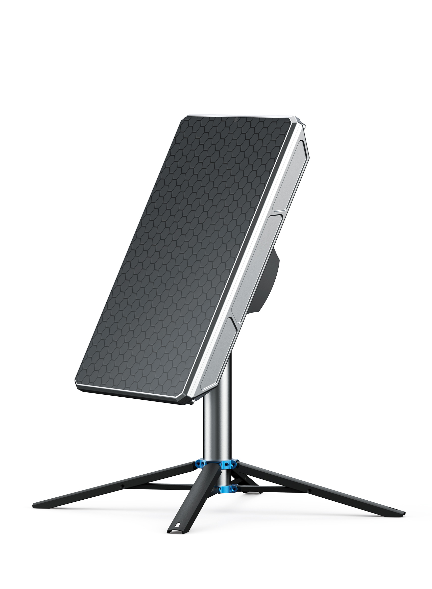 SATELLITE INTERNET ANTENNA provides broadband in areas without ground networks. The magnesium alloy shell and reinforced, weight-reducing structure make it sleek and portable for challenging environments. Its iconic ‘X’ symbol and ring light halo enhance aesthetics and user interaction. Featuring an active antenna, miniaturised servo motors, and easy divisibility into two parts, it fits in an IP68 waterproof case.
