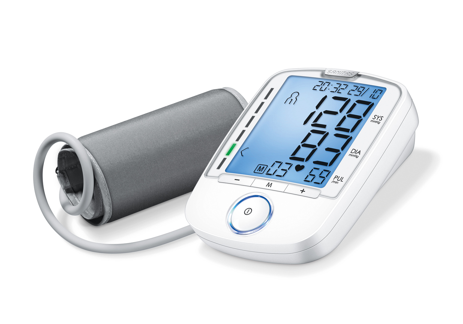 The prominent design elements of this fully automatic blood pressure monitor are its extra-large display and the operating knob, both of which are backlit in blue. The knob allows comfortable and easy use when taking the pulse and measuring blood pressure. In addition, the device features integrated arrhythmia detection. The coloured LED scale to the left of the display ensures quick classification of the measurements.