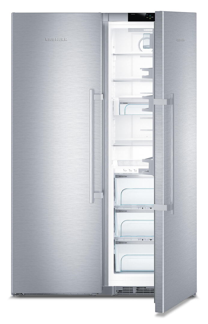 The SBSes 8663 provides a great deal of space for storing food and is very energy-efficient. The cooling technology produces minimal noise and is space-saving by being located in the plinth. The elegant HardLine design in stainless steel with side light edges is timeless. A SmartSteel surface makes fingerprints less visible. The LED ceiling light and LEDs integrated in the dividing panels provide homogenous illumination in the interior. The BioFresh self-retracting compartments are fully extendable.