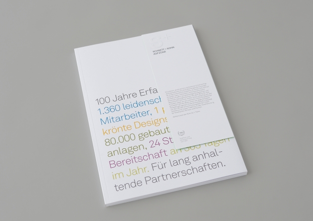 This 100-page corporate brochure was produced as part of the new visual identity for Schmitt + Sohn Elevators, a company with a working base throughout Europe. In this brochure, which illustrates the company’s values, products and references, it is the staff that gives the enterprise a face – each subject is represented by one employee who introduces it with a personal quote. The design concept surprises through a variable use of typography and distinguishes itself through consistent portrait and documentary photography.
