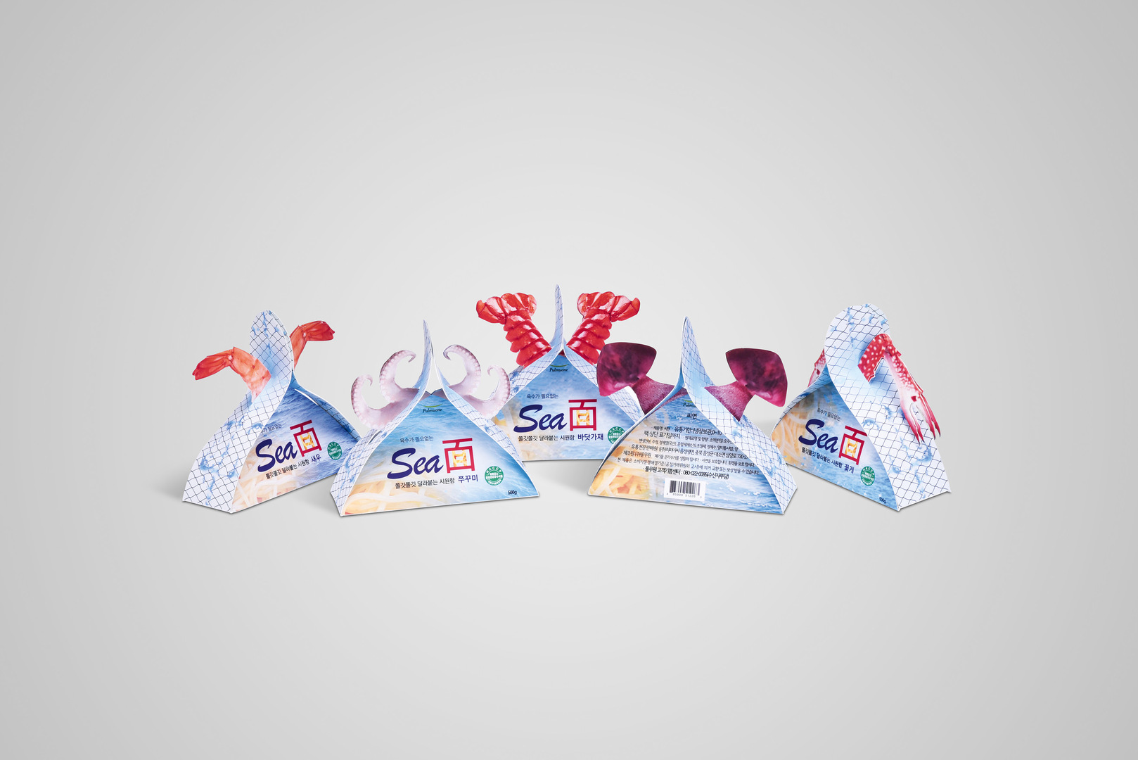 The package contains noodle dishes which include seafood. The coloured illustration at the front evokes an image of the motion and coolness of the sea. The design is also intended to emphasise that the food has been manufactured in harmony with the sea. On the sides, there is a pattern of the mesh of a fishing net. This expresses the freshness of the product. Particularly eye-catching are the claws, lobster tails or tentacles on the sides, which seem to be coming out of the net. They show the consumer which kind of seafood is used for the respective meal.