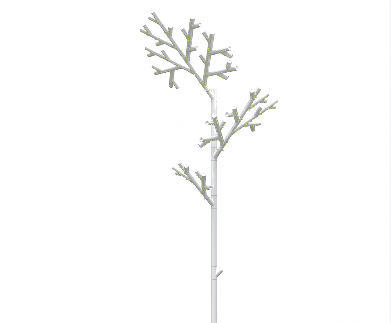 The free-standing shower has been conceived for both indoor and outdoor use. Its design imitates the forms of a delicate tree. It looks as if young ramifying branches grow out of the stem. On their undersides, green spray nozzles are fixed so that the water jet comes from three different directions and heights. The object features three shower functions that are controlled by turning the respective branch.