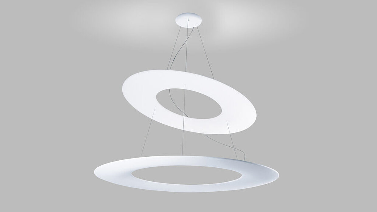 Serif is a sculptural lighting fixture with a spatial presence that changes with the viewing angle. Its circular luminous elements twist around their own axis, turning the circles into ellipses. The design is based on the playful use of geometric elements and connects differently-sized luminous rings with triangular coaxial connections. The minimal silicone diffusers achieve efficient illumination and stand out against the black powder-coated body.