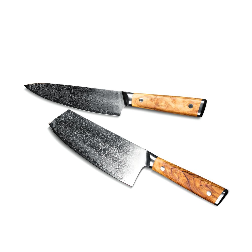 Developed together with professional chefs, these kitchen knives were designed with blade arches for optimised handling and good cutting properties. Their deeply etched damask structure features particular non-stick properties. To guarantee consistent quality, stainless VG10 steel from Japan was used. The handles are made of a cast hybrid-material of olive wood bowls and epoxy resin, which after curing creates a robust surface with a wood-like grain and feel.