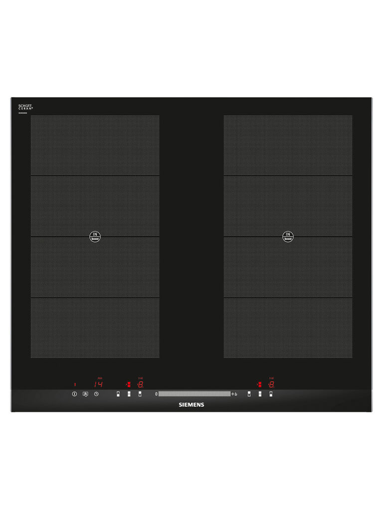 Pots and pans can be positioned anywhere on this hob because the flexible surface induction recognises number, size and shape of the respective cookware. With the Vario button, two separate cooking zones can be combined. The front edge of the glass ceramic features a producer-specific flat bevel, which separates the cooking zones from the control panel. The temperatures of all cooking zones are controlled by touchSlider technology.