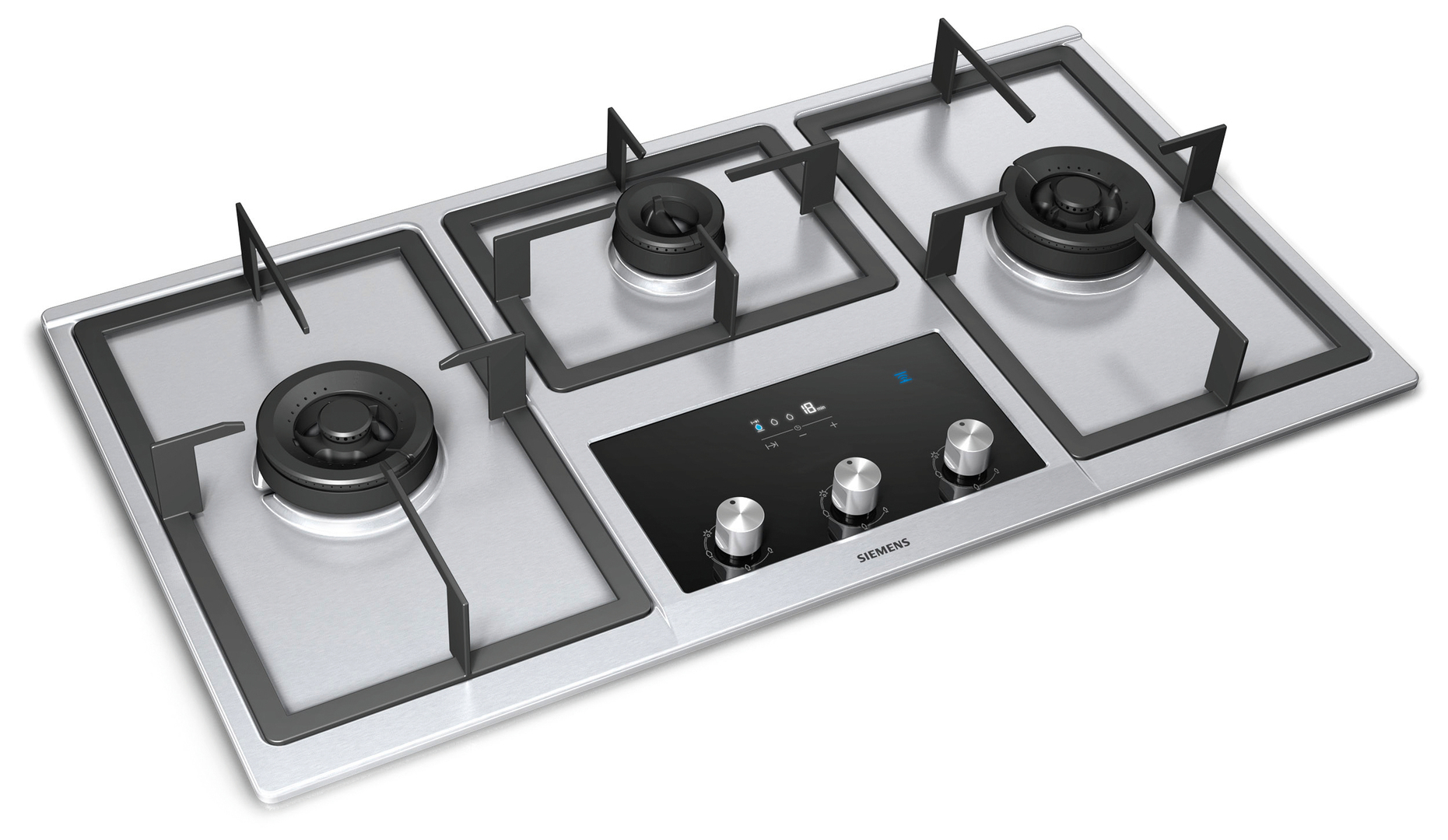 This impressive-looking gas hob follows a straight, well-proportioned form language. Precisely shaped pan supports characterise the appealing picture of the gas hob. Two efficient 4-kW gas burners and one with 1.7-kW are suitable for extra hot cooking and cooking with a wok. The reflective black tempered glass forms a striking contrast to the stainless steel hob, thus providing for a clear separation between the control and the cooking area. With three cylindrical control knobs in stainless steel look, the operating surface, made of tempered glass, offers a wide operating range. Other technical features, such as a timer and an interlink to control a compatible hood, create a high value of use.