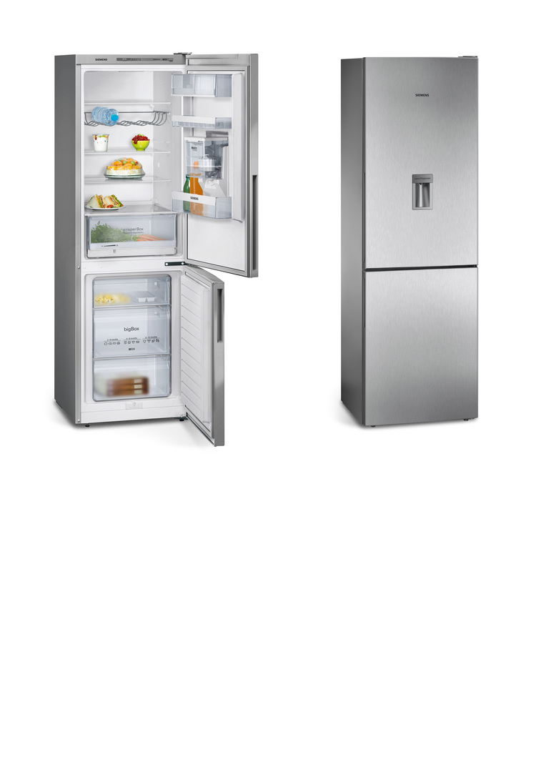 This fridge-freezer features a water tank with integrated filter. Cooled water can easily be filled into a glass or carafe through the ergonomically positioned outlet. In addition, the energy-efficient appliance has electronic device control. The style is reduced both inside and outside and thus timeless. Along with the water, the bottle rack adds attractive visual accents.