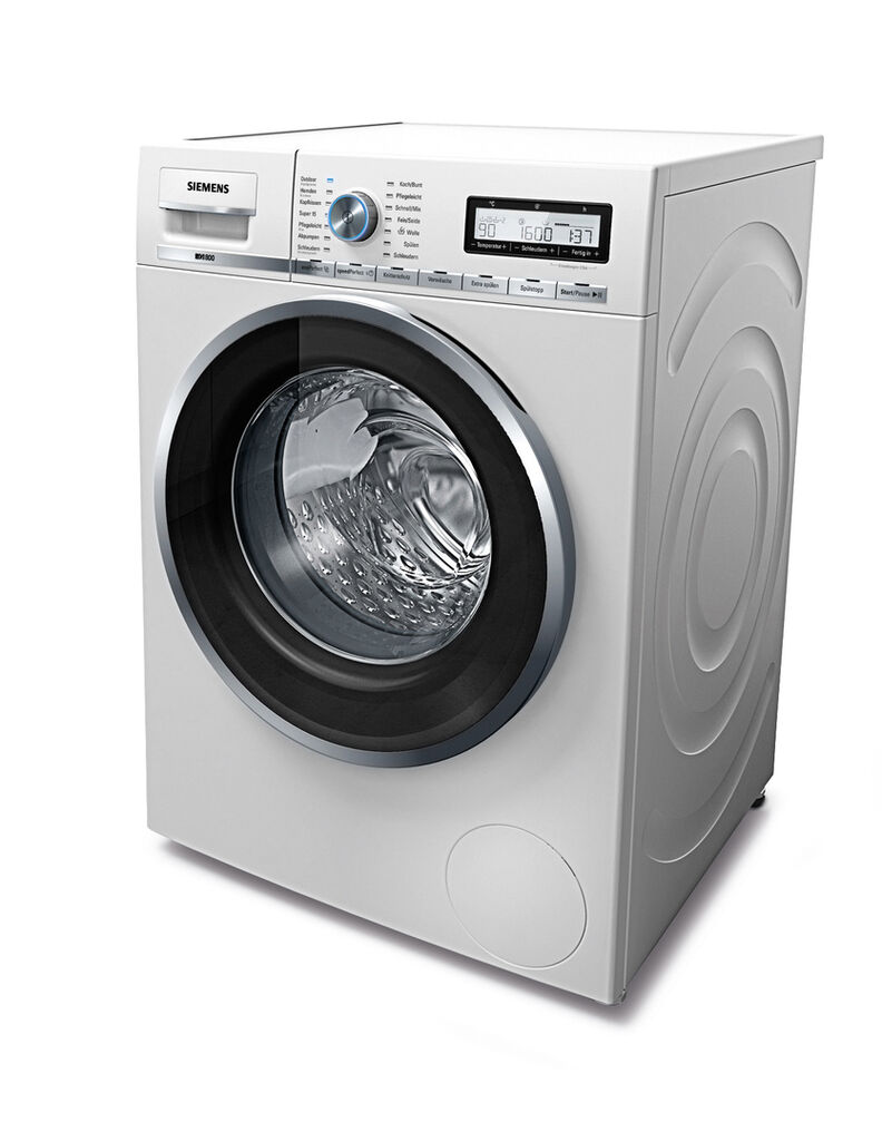 The appearance of this washing machine is characterised by a clearly arranged interface. It is operated via a precise jog dial with an LED display and a generously sized TFT screen, which clearly and concisely visualises the current settings. The large-dimensioned door illustrates the high loading capacity of up to 9 kg of laundry. The smooth protective glass panel and the precise metal ring of the door enhance the high-grade impression.