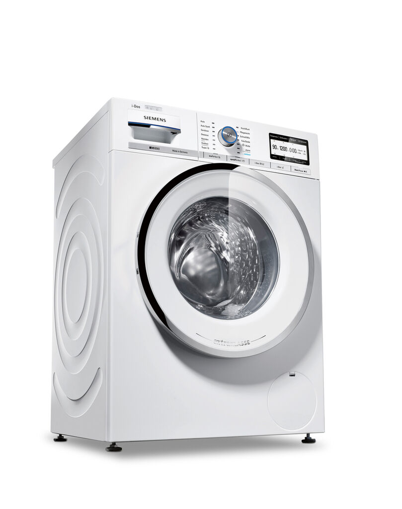 A balanced design concept characterises the corpus of a washing machine, the clearly arranged interface of which provides for efficient and precise control. The integrated automatic dosing system is sufficient for up to 20 laundry loads. The machine is operated via a jog dial and the active settings are shown on a generously dimensioned TFT display. All control elements are presented in a cool and elaborate metal design; they correspond with the metal ring of the door.