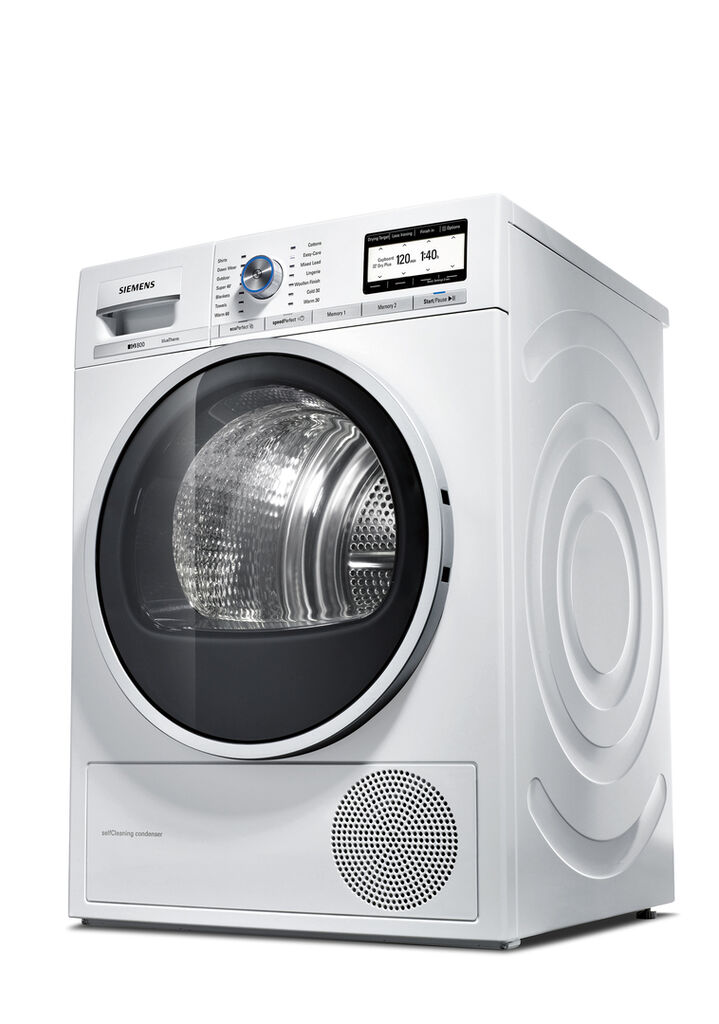 A harmonious design language characterises the general appearance of this dryer, which features a clearly organised interface. Its heat pump technology ensures a high level of energy efficiency across the entire life cycle. The machine is operated via an accurate jog dial with an LED display and a generously sized TFT panel. The smooth protective glass surface and the metal ring of the large-dimensioned door further enhance the premium impression.