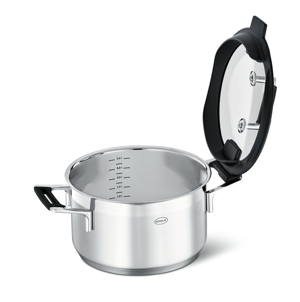 In the design of SILENCE PRO, special attention was paid to the innovative pot lid. To increase its ease of use, the glass lid is coated with silicone on both rim and handle. These silicone surfaces, including thumb support, protect against heat and make it easier to drain off liquid without the need for an additional strainer. For draining, the lid can either remain flush on the pot or snap into a designated, slightly offset position.