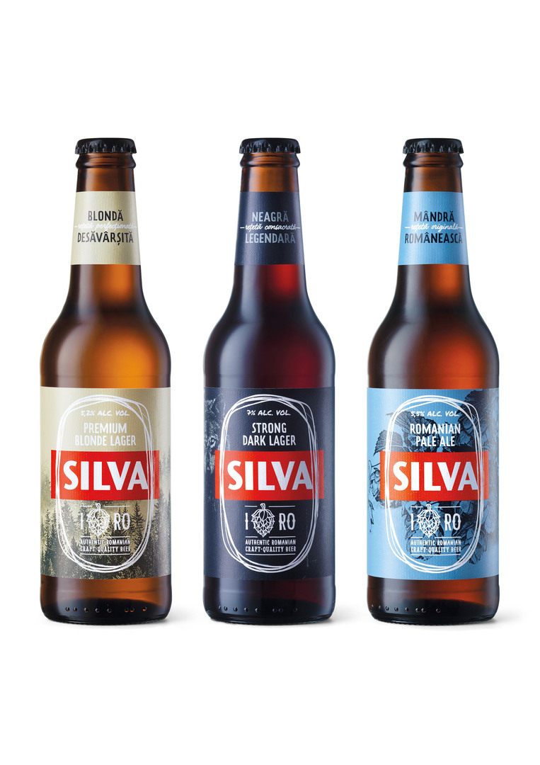 Silva is a 40-year-old Transylvanian beer brand and one of the most iconic local brands in Romania. Under a new strategic plan that positioned Silva as an authentic Romanian, craft-quality beer, the brand’s packaging was redesigned, comprising the improved Premium Blonde Lager and the Strong Dark Lager, as well as the new, crea- tively blended Romanian Pale Ale. The fresh packaging design conveys the Transylvanian spirit of the brand identity under a stylistic treatment of craftsmanship. Illustrations on the label present the local landscape along with beer ingredients like hop cones.