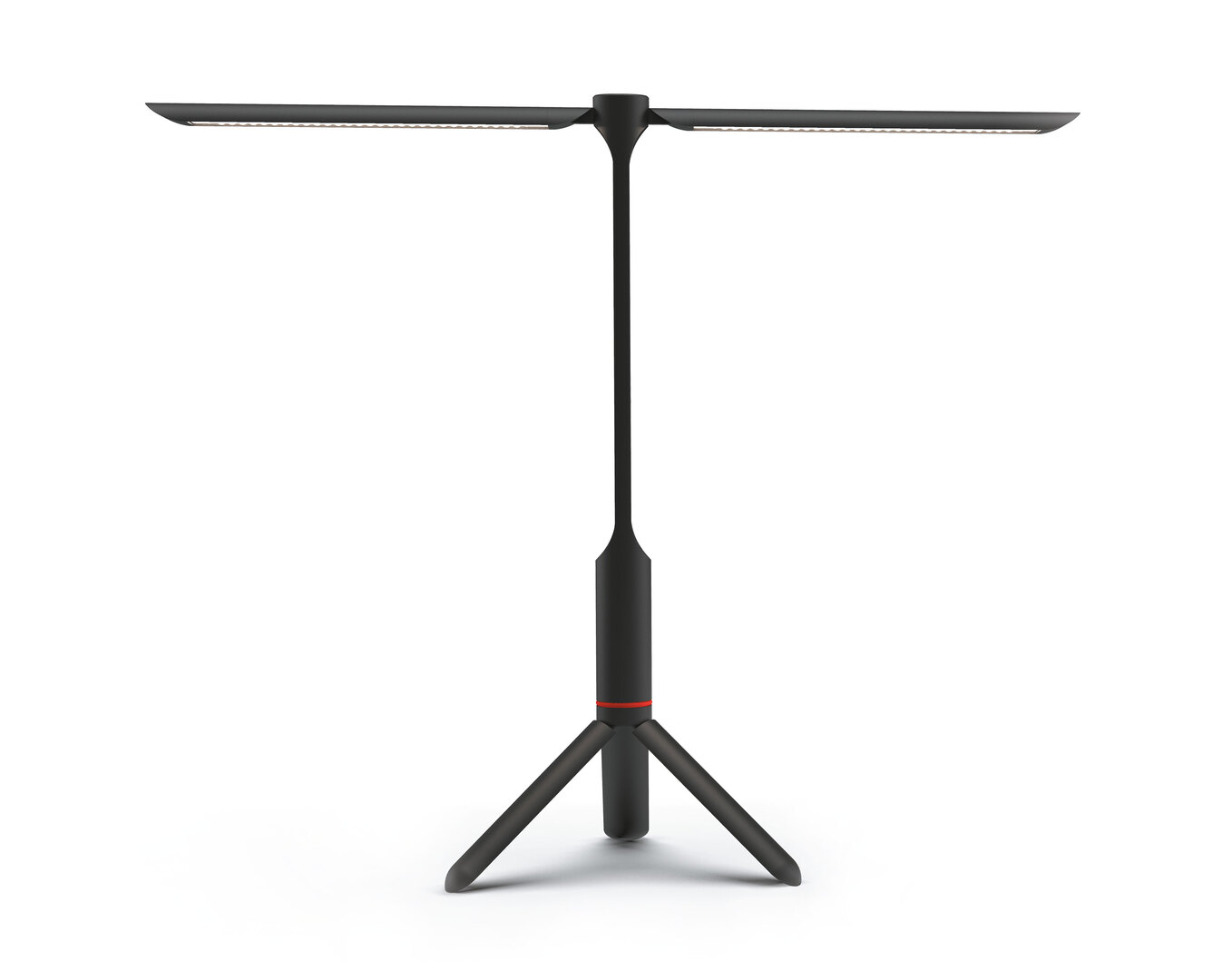 The Simple Portable Desk Lamp is an LED desk lamp that can be transformed into various shapes, folding into a stick for easy portability. The main feature of this lamp is its transformability. Turning on or rotating each component activates different lighting functions, and its geometric beauty is showcased in its various forms. Its integrally moulded body is simple and stylish, and includes an independent double-touch and light-adjusting switch. It incorporates a high-capacity lithium battery that is rechargeable via USB for easy portability and outdoor use. The light sources can also be rotated to facilitate its use by two people.