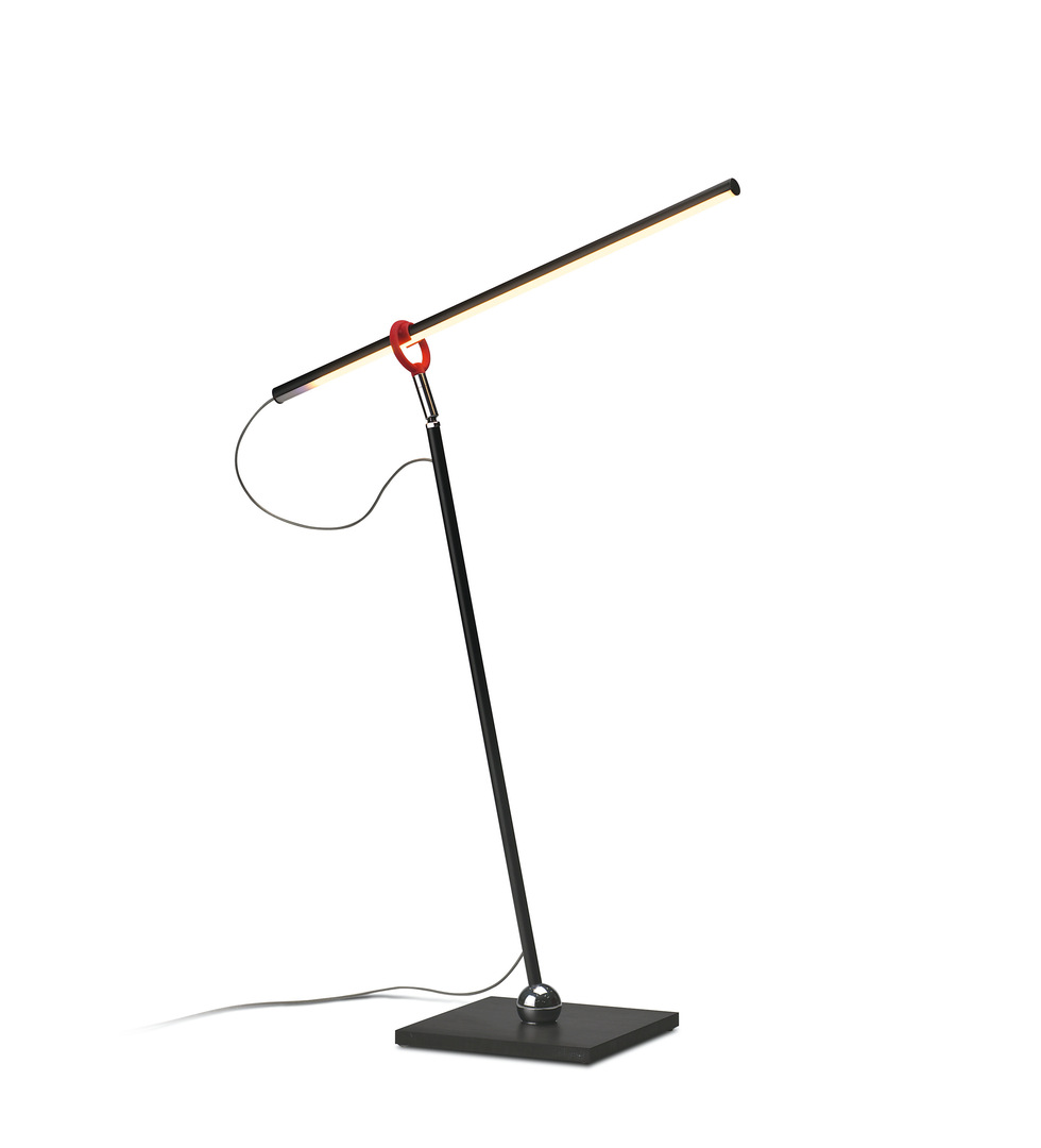 Slimline 01 is an LED desk lamp that can be flexibly positioned in any desired way for reading and working. Because of a new patented red clip fixture, the aluminium LED profile can be adjusted by rotation around the longitudinal axis and by shifting it parallel to this axis. Integrated into the LED aluminium profile, the gesture sensor allows to switch the lamp on and off, and enables variable dimming by simple gestures of the hand.