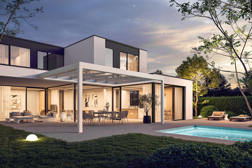 The minimalist design and elegant construction of the SO!Crystal pergola facilitate harmonious integration into contemporary architecture.