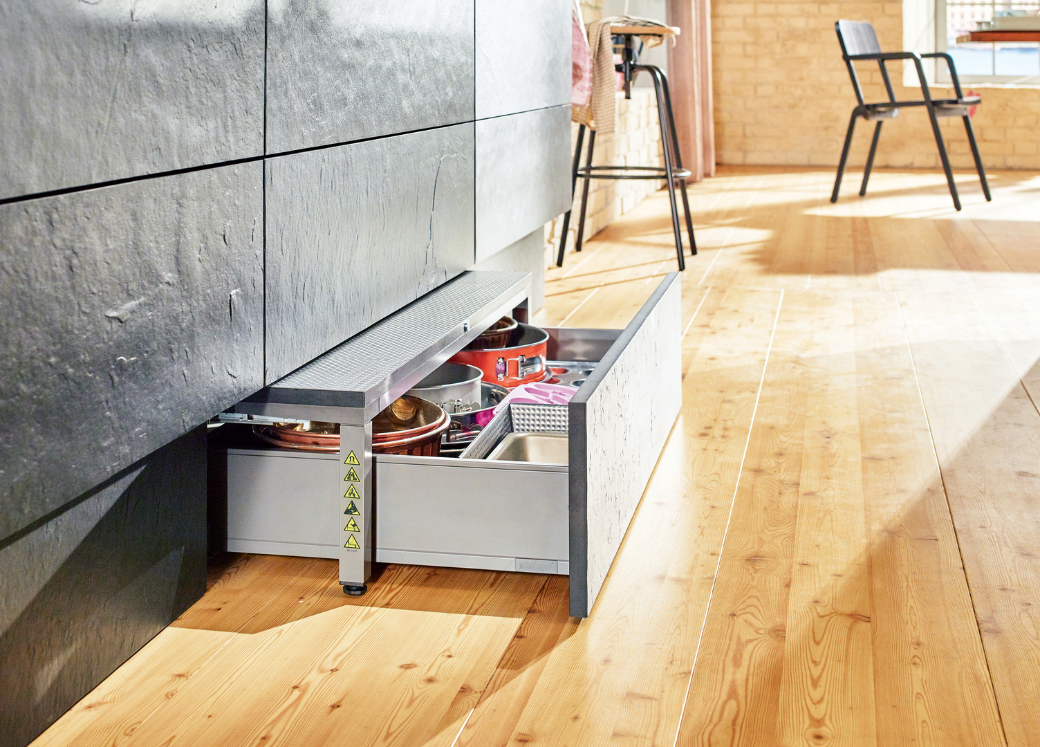 This plinth solution provides easy access to wall cabinets and lets children, for instance, lend a helping hand in the kitchen. With a light touch, the plinth moves out of the furniture and can be used as a tread. The locking device fixing the cabinet application is activated by a load of just 8 kg. To make use of the storage space in the plinth, the tread surface is pushed back into the furniture with one touch and the space underneath is exposed. The plinth solution can be implemented in all box and runner systems.
