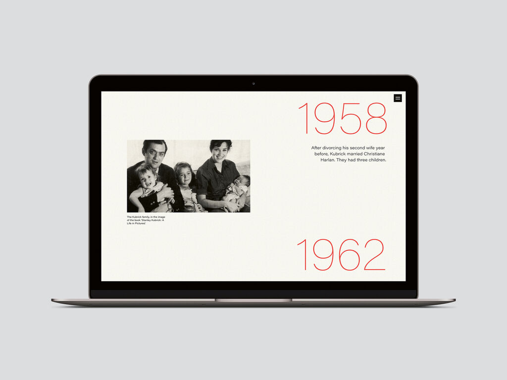 Marking Stanley Kubrick’s 90th birthday and dedicated to his life and work, this website was initiated for the purpose of education and with deep respect for the cinematography legend. Following the idea and intention to make the site feel like a movie, allegorically, the narration is performed in chronological order and features his films as well as some interesting and enticing facts, acquainting visitors with the film director’s traits and techniques. Infinite scrolling is used as the main navigation element, while specially created animations and 3D graphics lend atmosphere and interaction to the user experience.