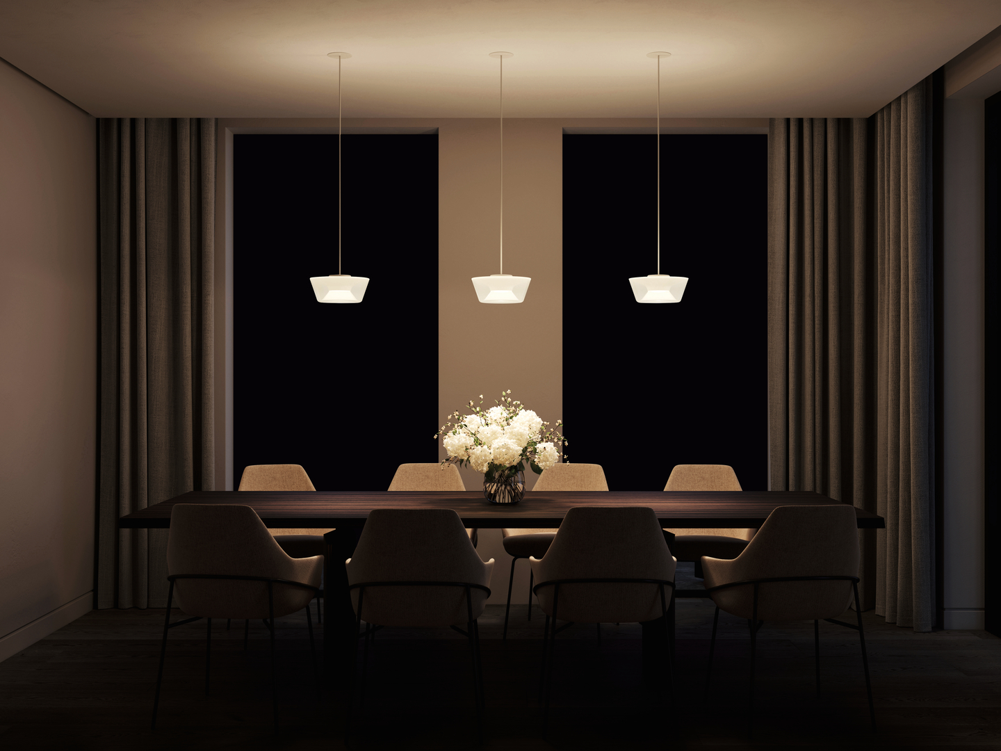 This pendant luminaire features a novel operation that shapes the atmosphere of a room. Utilising a proprietary waveguide technology, the body appears transparent when the light is off and opaque when the light is switched on. The luminaire body contains two concealed, independently controlled and dimmable light sources, yielding a directional downlight within an illuminated sphere. This creates ambient light that is both direct and warm.