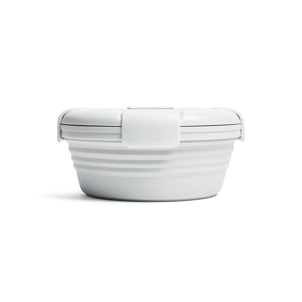 The collapsible design of this food container allows for a space-saving use both at home and on the go. The stackable bowl is closed by a leak-proof lid with four removable clasps. Underneath each of the clasps are vent holes allowing steam to escape when heating food in them in the microwave. The product components are separable and can be cleaned in the dishwasher. Their pollutant-free material is recyclable.