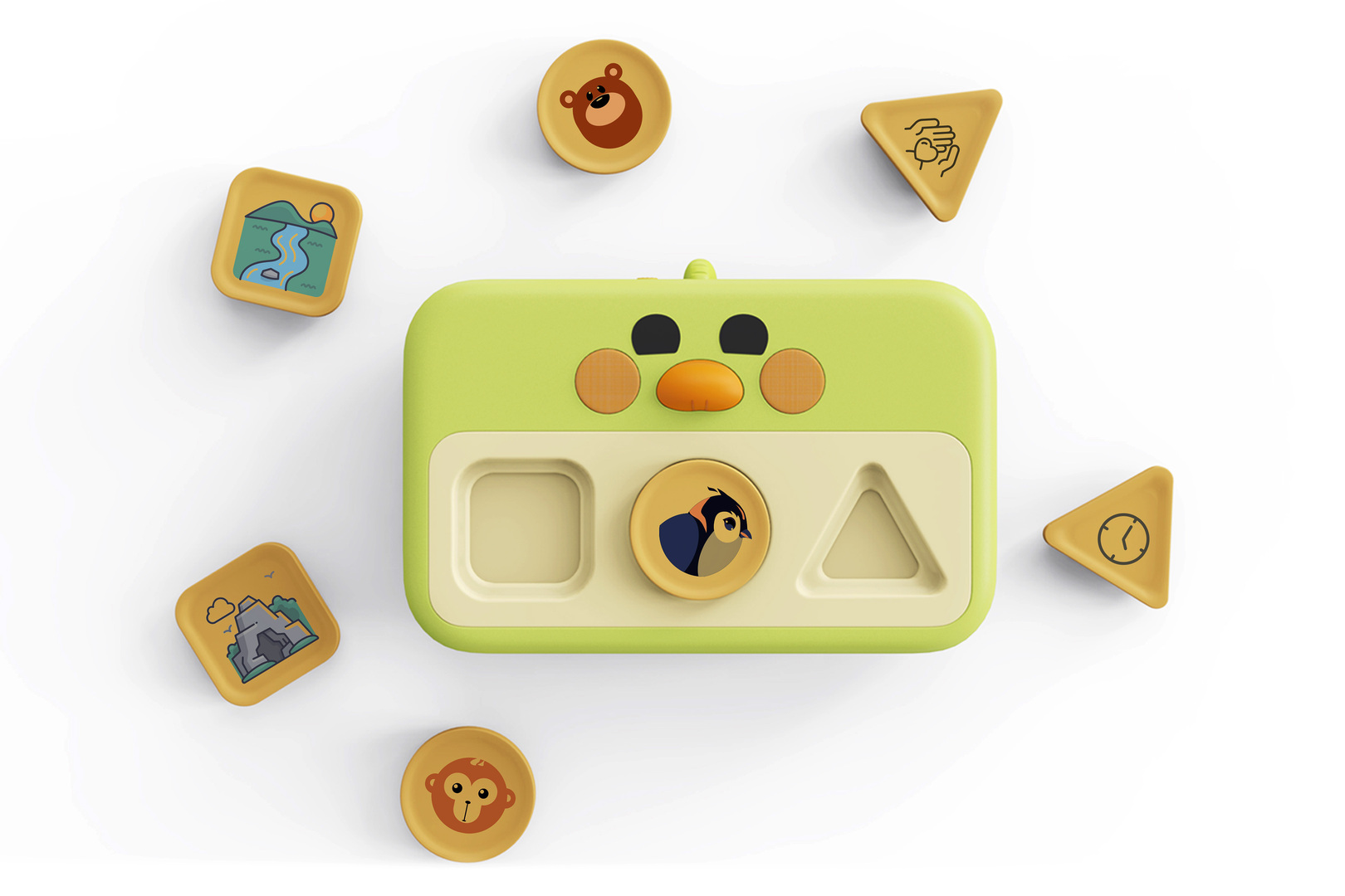 The modular design of Storypod not only makes children aware of the components of stories, but it also allows for limitless freedom in play. Each Storypod story is made up of three modules: setting, characters and theme. These three modules are represented by square modules, circular modules and triangular modules — inferring to the child that the free combination of different modules can result in a complete story. Using the figurative patterns on the modules can help children become more aware of storytelling. They are encouraged to arrange modules of various shapes on the Storypod before pressing the orange play button. The Storypod will then play the corresponding story. This product helps children understand the concept of stories, which is important in early education.