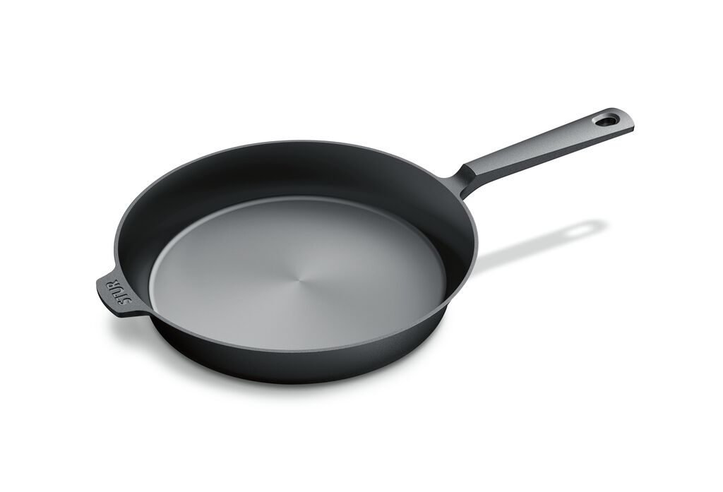 As a result of reinterpreting traditional cast-iron cookware, the bottom and walls of this frying pan are CNC-finished after casting. This reduces its weight and makes the pan easier to handle. The cast-iron pan is made of recycled iron, manufactured in Germany and free of toxic substances. The robust material promotes even heat distribution, while the smoothed surface in combination with a baked-on vegetable oil coating ensures good non-stick characteristics.