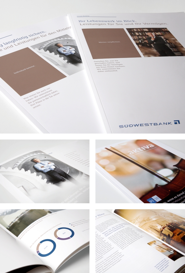 A brand identity was developed for SÜDWESTBANK that individually addresses different target groups, focusing especially on upmarket clientele. The claim “Werte verbinden” (Values connect people), in positioning the medium-size private bank, highlights an ambiguity of material and immaterial values. A unique element of the brand design are so-called dialogue boxes – comprised of dialogues of text or image/text that foster communication – which can be applied flexibly to render a vivid experience of identity. In addition, distinctive and authentic imagery connects all communication media. A classic depth-of-field blur symbolises the bank’s proximity to its customers.