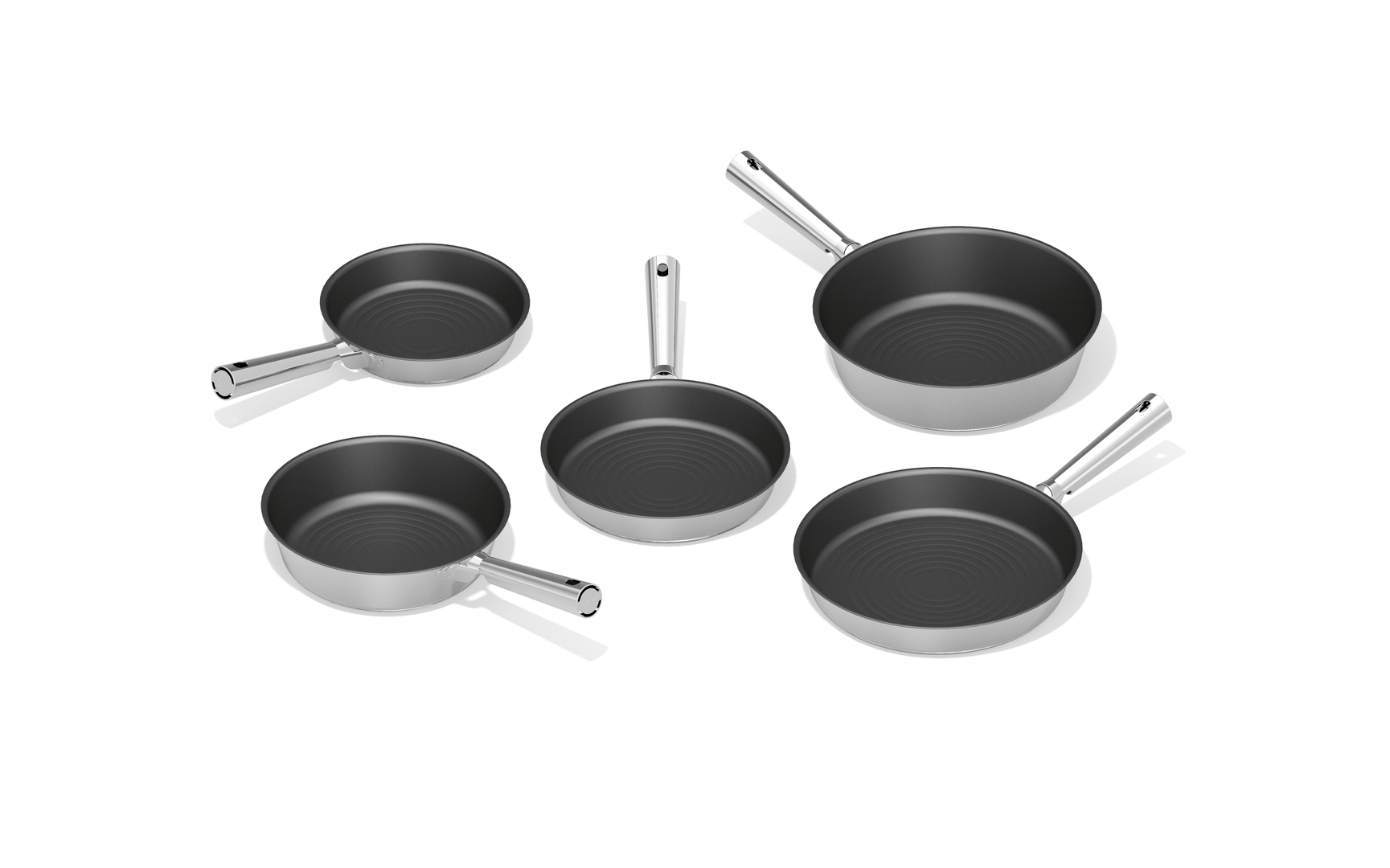The Suit Stainless Frypan series combines induction compatibility with safety and an appealing design. The pans feature a non-stick coating and a triple-layer base with a wave design that centrally collects oil and promotes even heat distribution. The simple round handle provides a good grip and minimises heat conduction due to its hollow structure. The U-shaped handle design allows for easy stacking for space-saving storage.