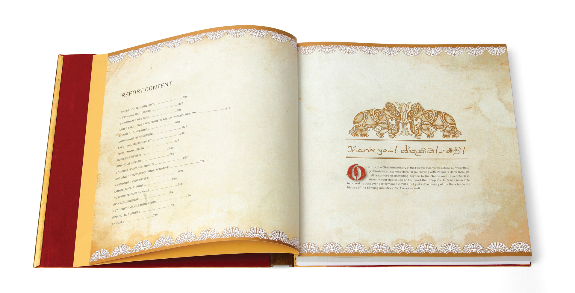 In 2011 the People’s Bank celebrated its Golden Anniversary – 50 years of service as a State bank for the people of Sri Lanka. Its 2011 annual report reflects the significance of this event in all aspects of the design. The custom-made brass cover is embellished with traditional Sri Lankan art engravings. The legend in Sinhala letters is a greeting phrase of Sanskrit origin meaning “May it be well with thee”. This idea also reflects the philosophy of the bank: serving the clients, so that they achieve prosperity.