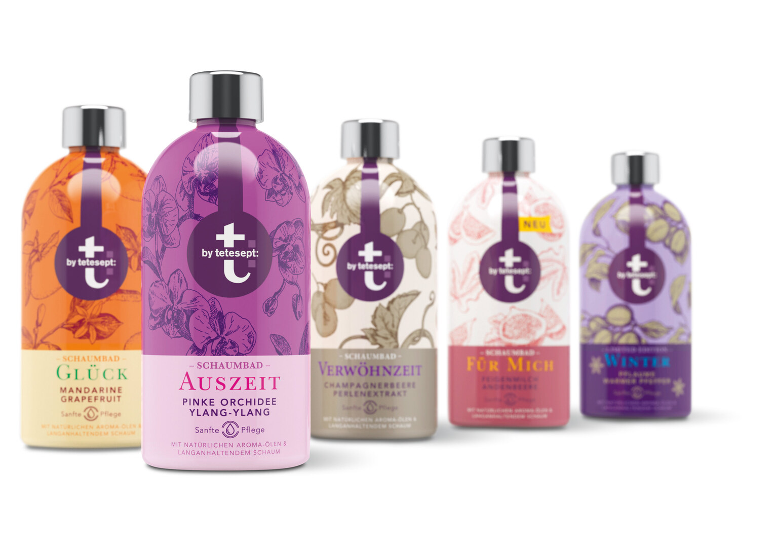 The sub-brand “t: by tetesept” focuses on pleasure instead of medical benefits. As its most important communication tool, the packaging design stands out at the point of sale and increases consumers’ willingness to buy it. For four bubble-bath products, different packaging variants were created to communicate not only the new sub-brand, but also their respective attributes. The bubble baths were designed as eye-catchers for the bathroom. Each design uses key visuals related to the fragrances and ingredients of the respective type, connecting the brand with a modern lifestyle. All packaging consistently follows the same two-part design: a colourful banderole above and a section in solid colour below.