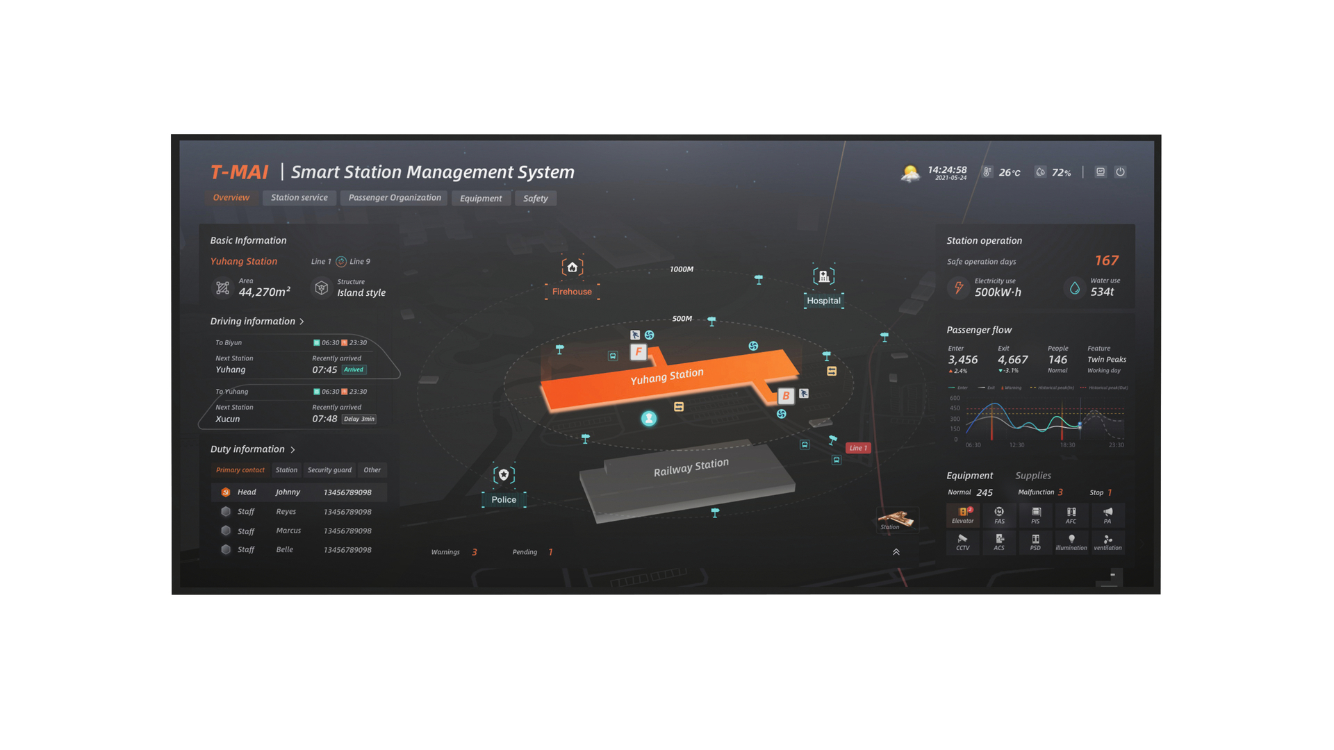 The smart station management system was developed for the daily management of underground rail operations. Sensors, HD monitors and sensing devices provide data that the system uses to create a digital image of the station in multiple dimensions. It reports risk factors such as high passenger volume or equipment failure and automatically adjusts the emergency plan. Orientation is provided by means of an intuitive colour scheme that highlights critical values in red, while normal values are shown in green. The spatial representation of the station is elegantly combined with semi-transparent tabular overviews, providing a seamless user experience.