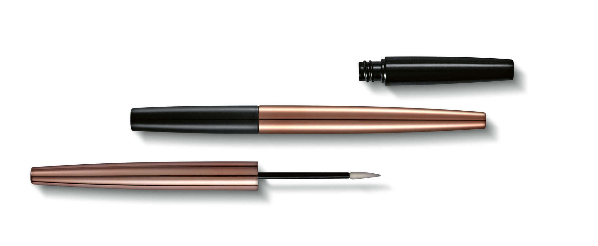 The design of this eyeliner aims at precise application of the liquid. Thanks to its smooth contours, the tool lies agreeably in the hand. Reminiscent of a ballpoint pen, the grip area allows comfortable and controlled positioning of the fingertips. The metallic surface is available in elegant silver or a warm rose tone and marks the luxurious appearance of the eyeliner. The black metal cap closes precisely and sets a harmonious colour accent.