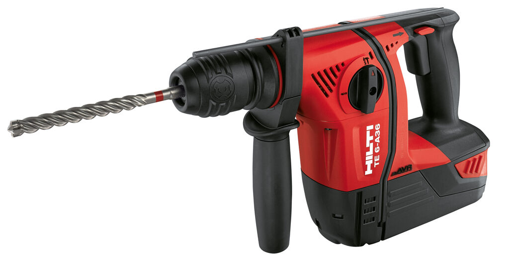 At the heart of the TE 6-A36 cordless rotary hammer is a specially adapted electro-pneumatic hammering mechanism geared to high mechanical resilience and a long life cycle. The rotary hammer achieves a constantly high drilling performance in the 5 to 16 mm diameter range and has an excellent battery capacity for drilling in concrete and masonry. With its low weight of merely 4 kg, the hammer ensures a high degree of mobility. The ergonomic grip design and the active vibration reduction allow for a comfortable working situation. As such, the hammer can be used for extended periods without inducing premature fatigue. The dust-removal system TE DRS-6-A, specially designed for the TE 6-A36, is classified particularly for use in working environments with very fine dust.